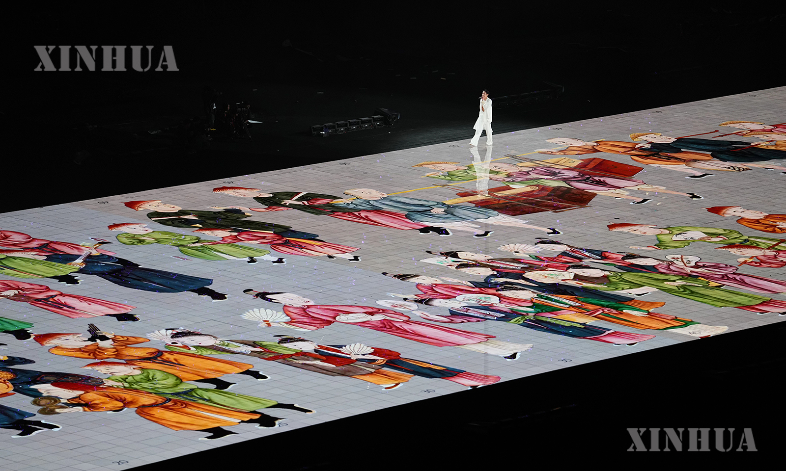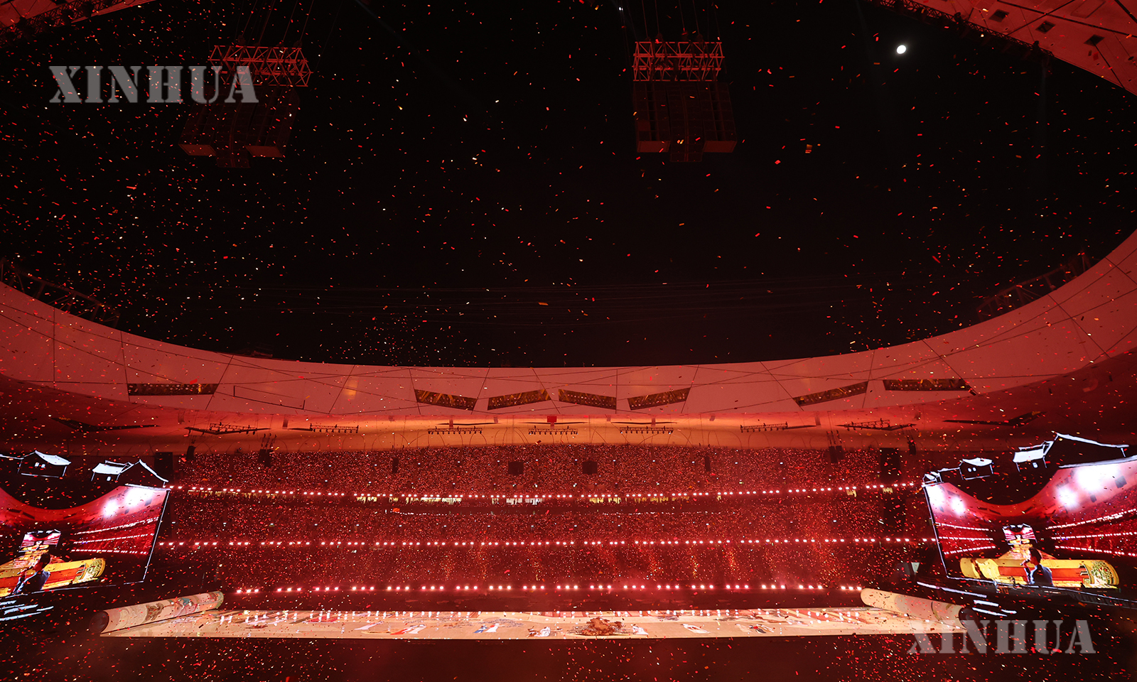 တရုတ်နိုင်ငံ ပေကျင်းမြို့ အမျိုးသားအားကစားကွင်း၌ ကျင်းပသည့် စတိတ်ရှိုးပွဲ၌ တိုင်းရင်းသား အဆိုတော်များနှင့်အတူ ဖျော်ဖြေတင်ဆက်နေသော ကျန်းရိရှင်းအား ၂၀၂၅ ခုနှစ် အောက်တိုဘာ ၆ ရက်က တွေ့ရစဉ် (ဆင်ဟွာ)