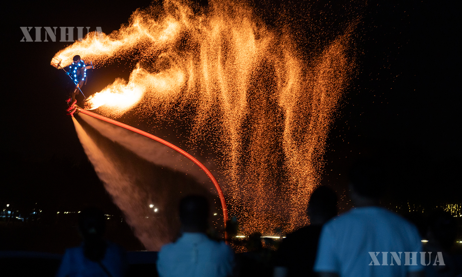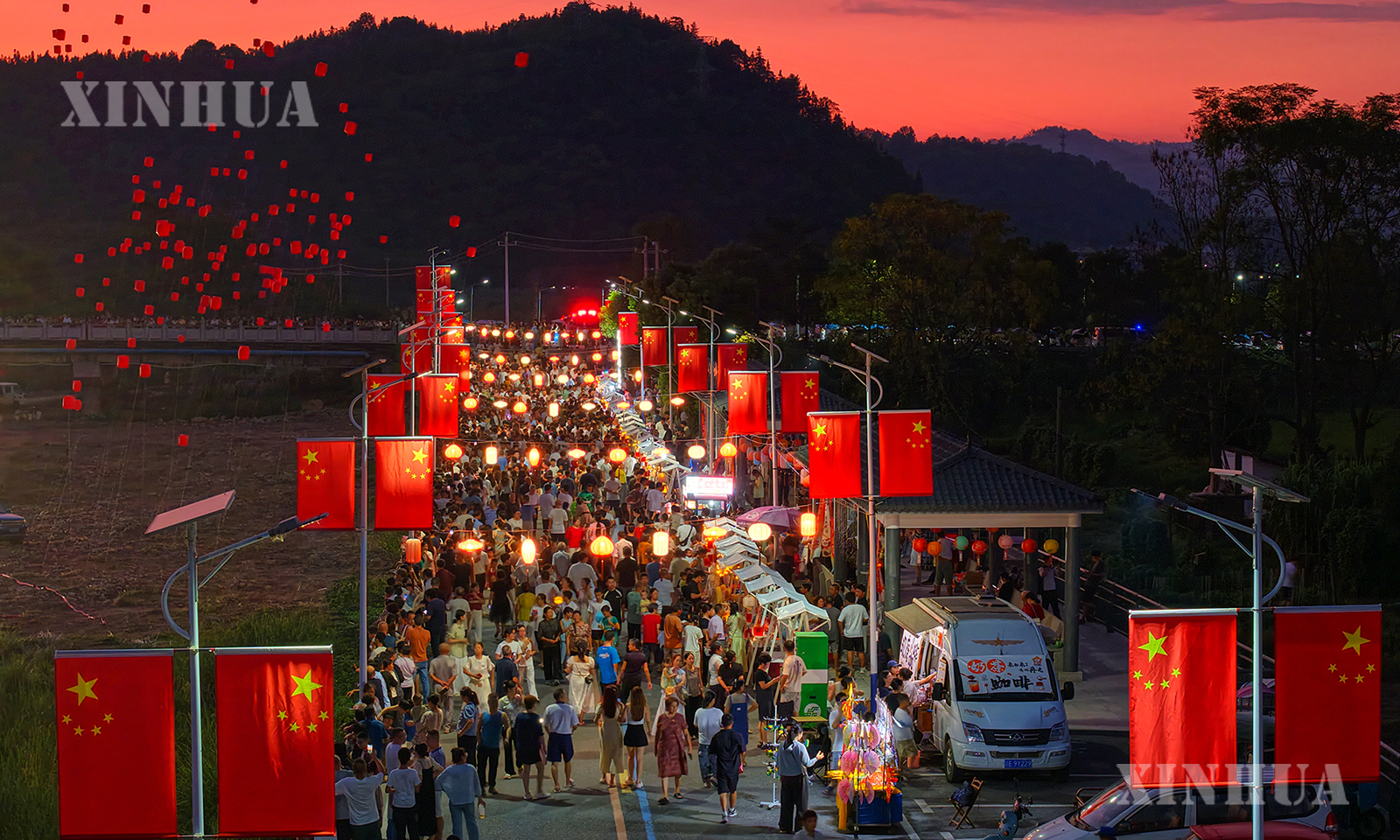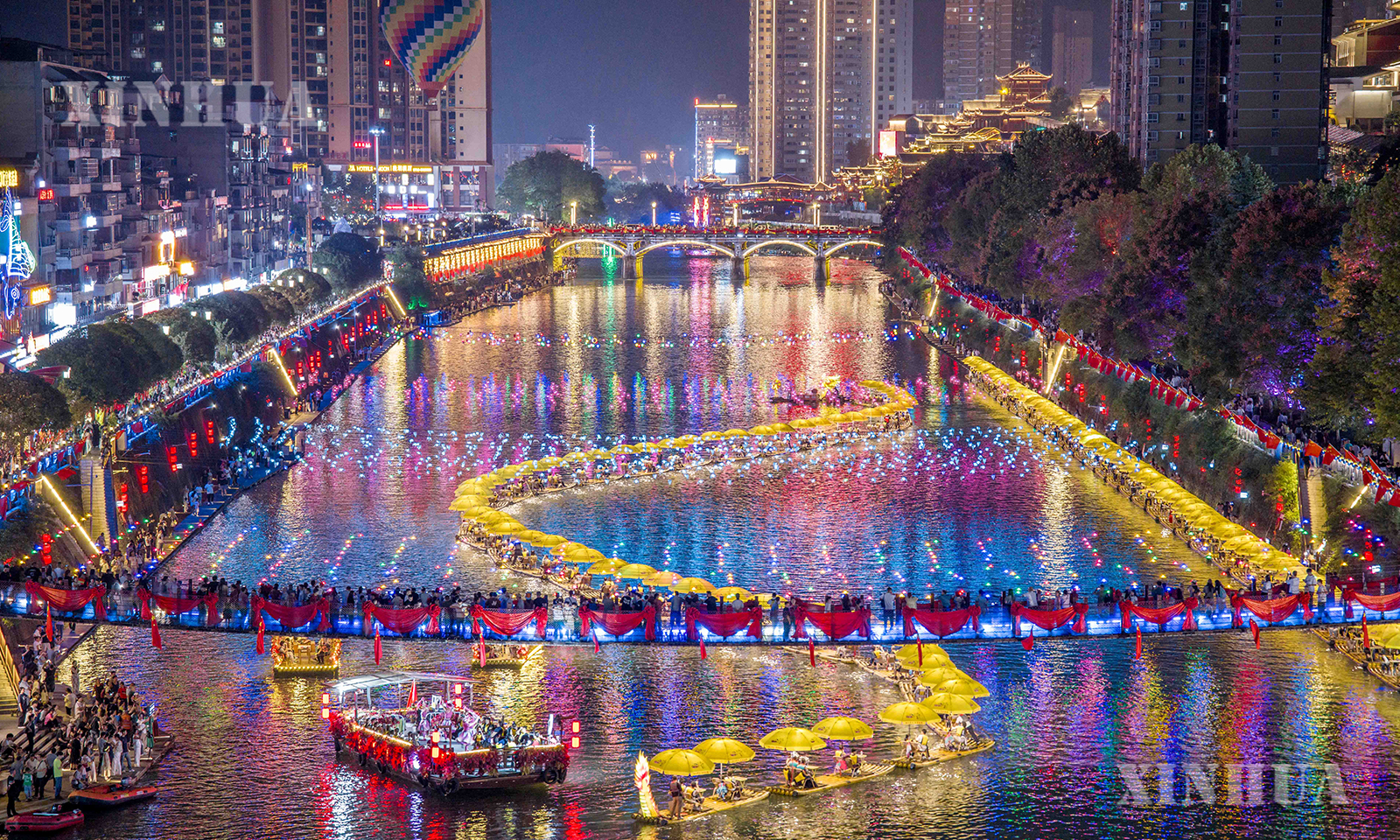 တရုတ်နိုင်ငံ ဟူပေပြည်နယ် ရွှမ်းအန်းခရိုင်၌ ဝါးဖောင်ဖြင့် ညမြင်ကွင်းရှုစားနေသော ခရီးသွားဧည့်သည်များကို ၂၀၂၅ ခုနှစ် အောက်တိုဘာ ၆ ရက် ညပိုင်းက တွေ့ရစဉ် (ဆင်ဟွာ)