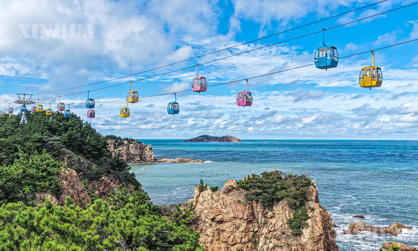 တရုတ်နိုင်ငံ ဆန်းတုန်းပြည်နယ် ရုန်ချိန်မြို့ ချိန်ဆန်းထို ရှုခင်းသာ၌ ကေဘယ်ကားဖြင့် ရှုခင်းရှုစားနေသော ခရီးသွားဧည့်သည်များကို ၂၀၂၅ ခုနှစ် အောက်တိုဘာ ၇ ရက်က တွေ့ရစဉ် (ဆင်ဟွာ)