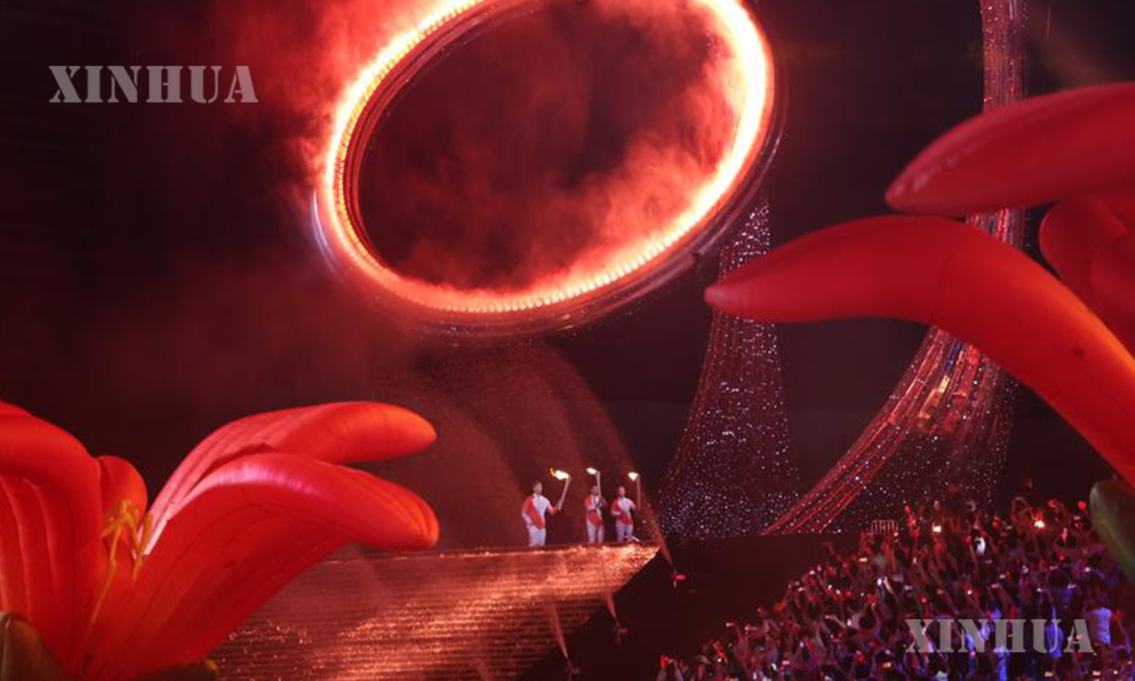 1. 11月9日,主火炬被点燃。 当日,第十五届全国运动会开幕式在广东奥林匹克体育中心举行。 新华社记者 雒圆 摄