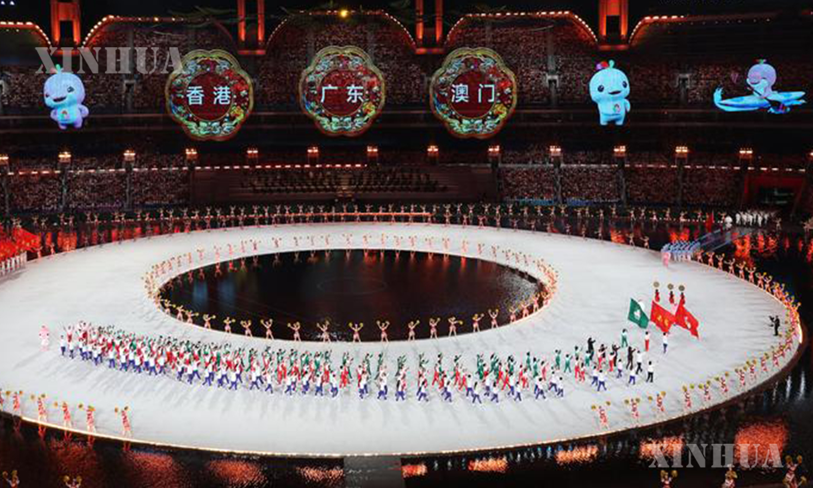 2. 11月9日,广东省体育代表团、香港特别行政区体育代表团和澳门特别行政区体育代表团在入场仪式上共同入场。 当日,第十五届全国运动会开幕式在广东奥林匹克体育中心举行。 新华社记者 卢汉欣 摄