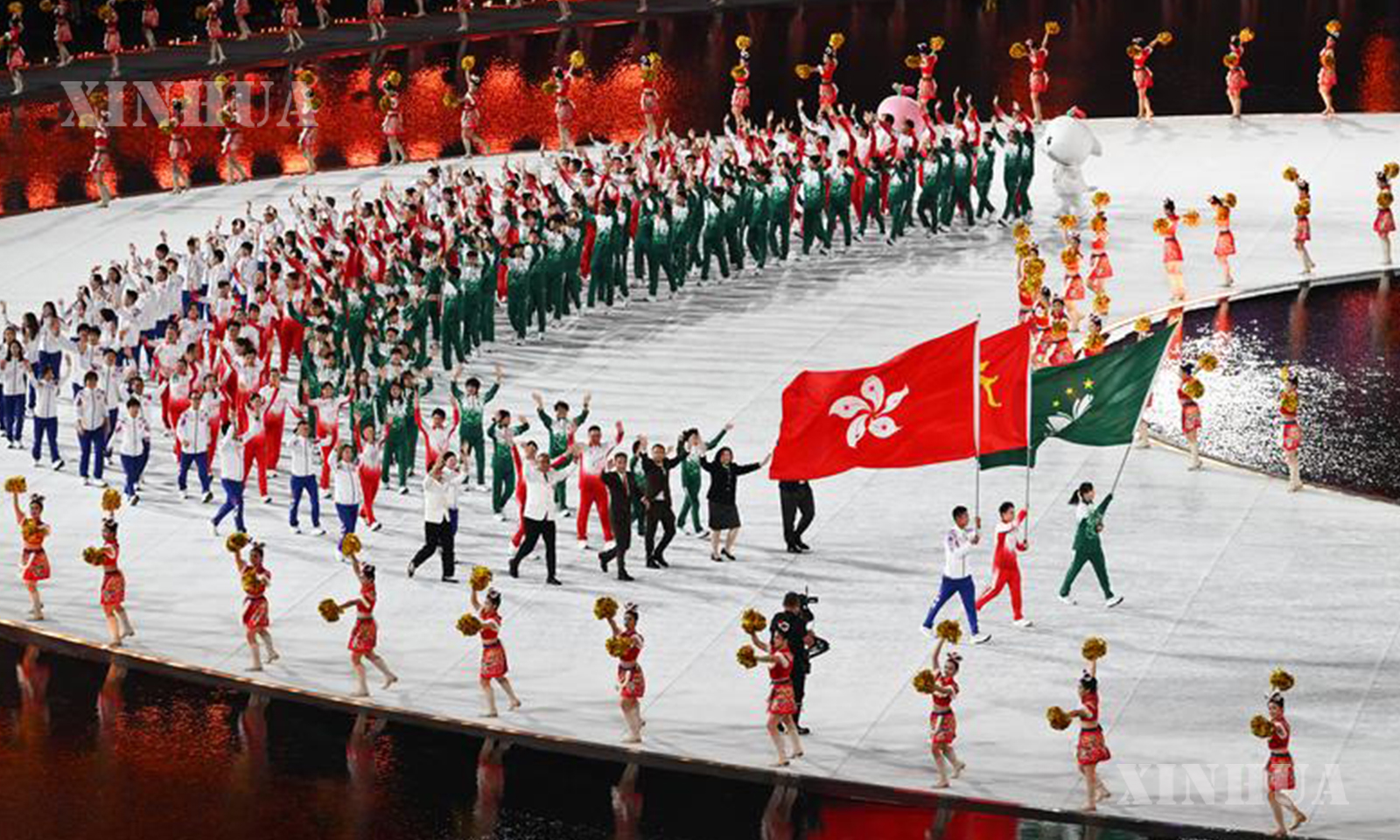 ၁၅ ကြိမ်မြောက် အမျိုးသားအားကစားပြိုင်ပွဲ ဖွင့်ပွဲအခမ်းအနားတွင် ကွမ်တုန်းပြည်နယ် အားကစားကိုယ်စားလှယ်အဖွဲ့၊ ဟောင်ကောင်အထူးအုပ်ချုပ်ခွင့်ရဒေသ အားကစားကိုယ်စားလှယ်အဖွဲ့နှင့် မကာအိုအထူးအုပ်ချုပ်ခွင့်ရဒေသ အားကစားကိုယ်စားလှယ်အဖွဲ့များ ဖွင့်ပွဲအခမ်းအနားကျင်းပရာနေရာသို့ အတူတကွ ဝင်ရောက်လာသည်ကို ၂၀၂၅ ခုနှစ် နိုဝင်ဘာ ၉ ရက်က တွေ့ရစဉ် (ဆင်ဟွာ)