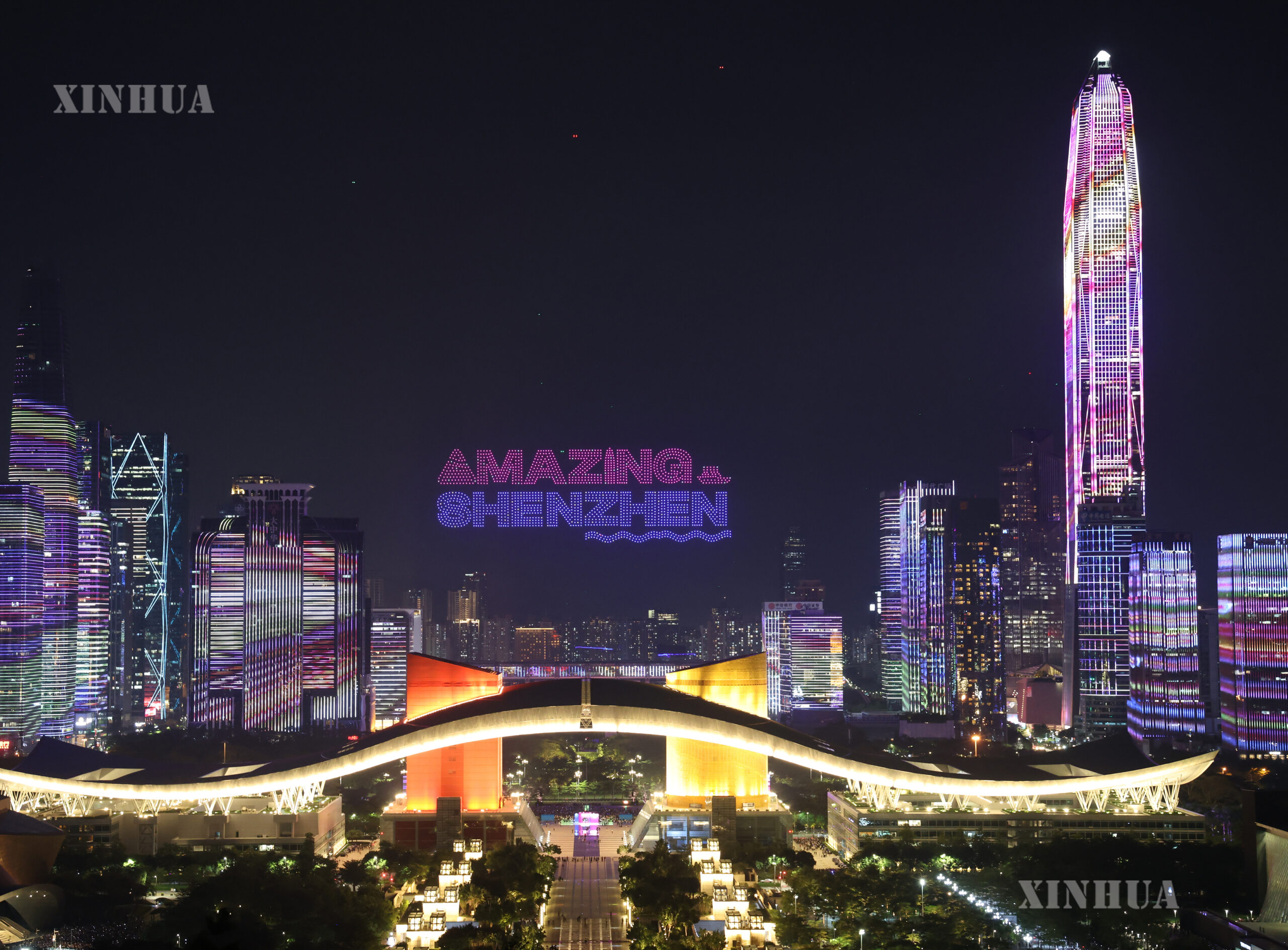 图说2:8月26日,深圳经济特区建立45周年无人机灯光秀表演在深圳市民广场举行。华社记者 梁旭 摄
