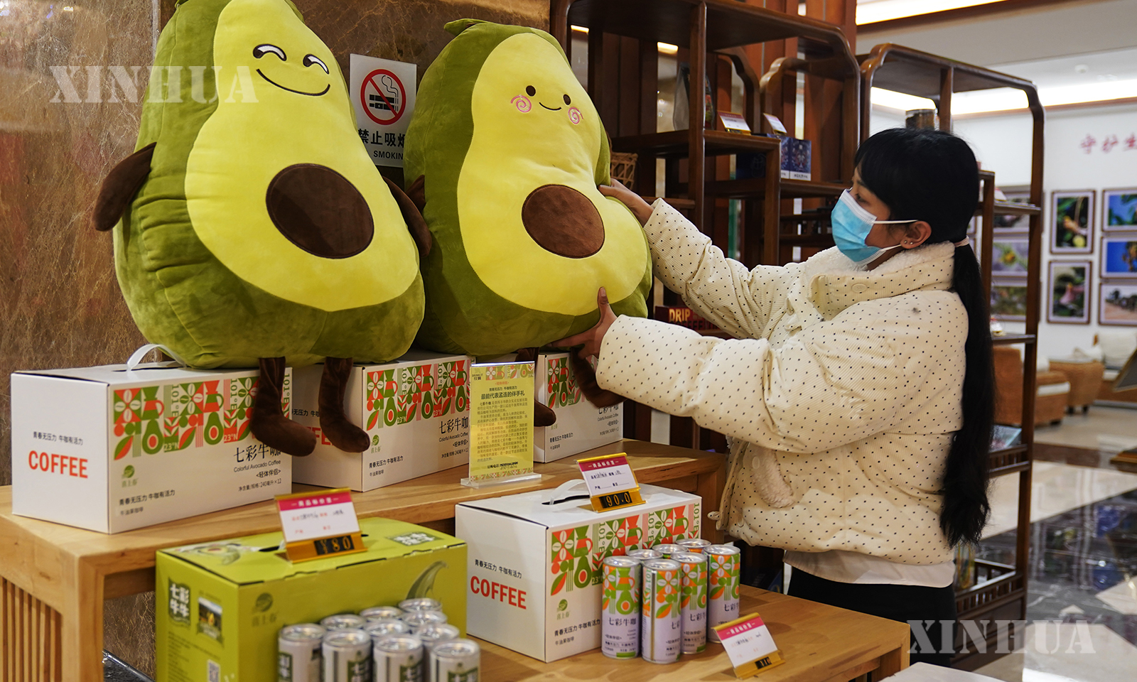 图说1:11月18日,在云南省普洱市孟连县一酒店,工作人员在摆放牛油果文创产品。 新华社发(梁志强摄)