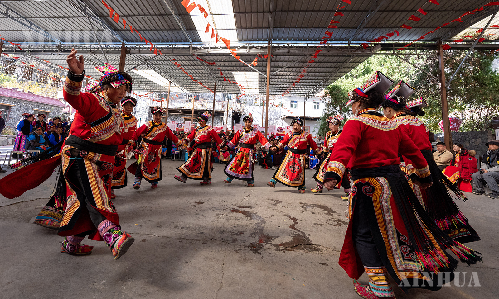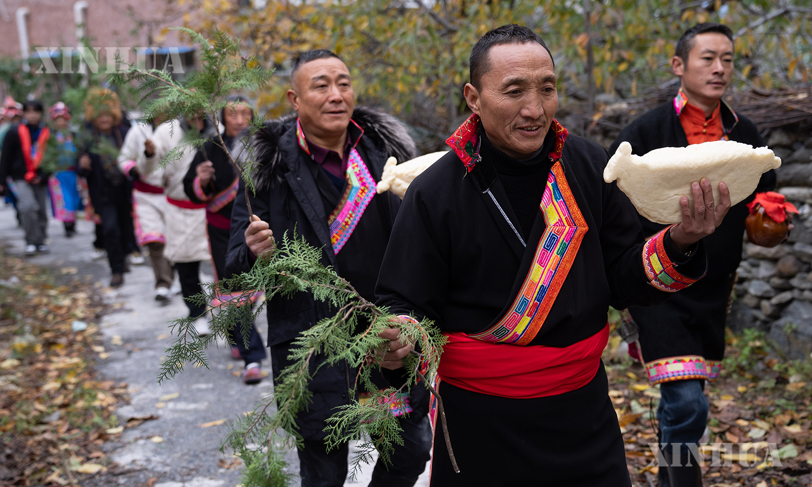 11月18日,四川省阿坝藏族羌族自治州茂县赤不苏镇举行特色民俗文化活动,当地群众身着传统民族服饰,与游客一起载歌载舞、品尝咂酒、共话丰收,喜迎一年一度的羌历新年。