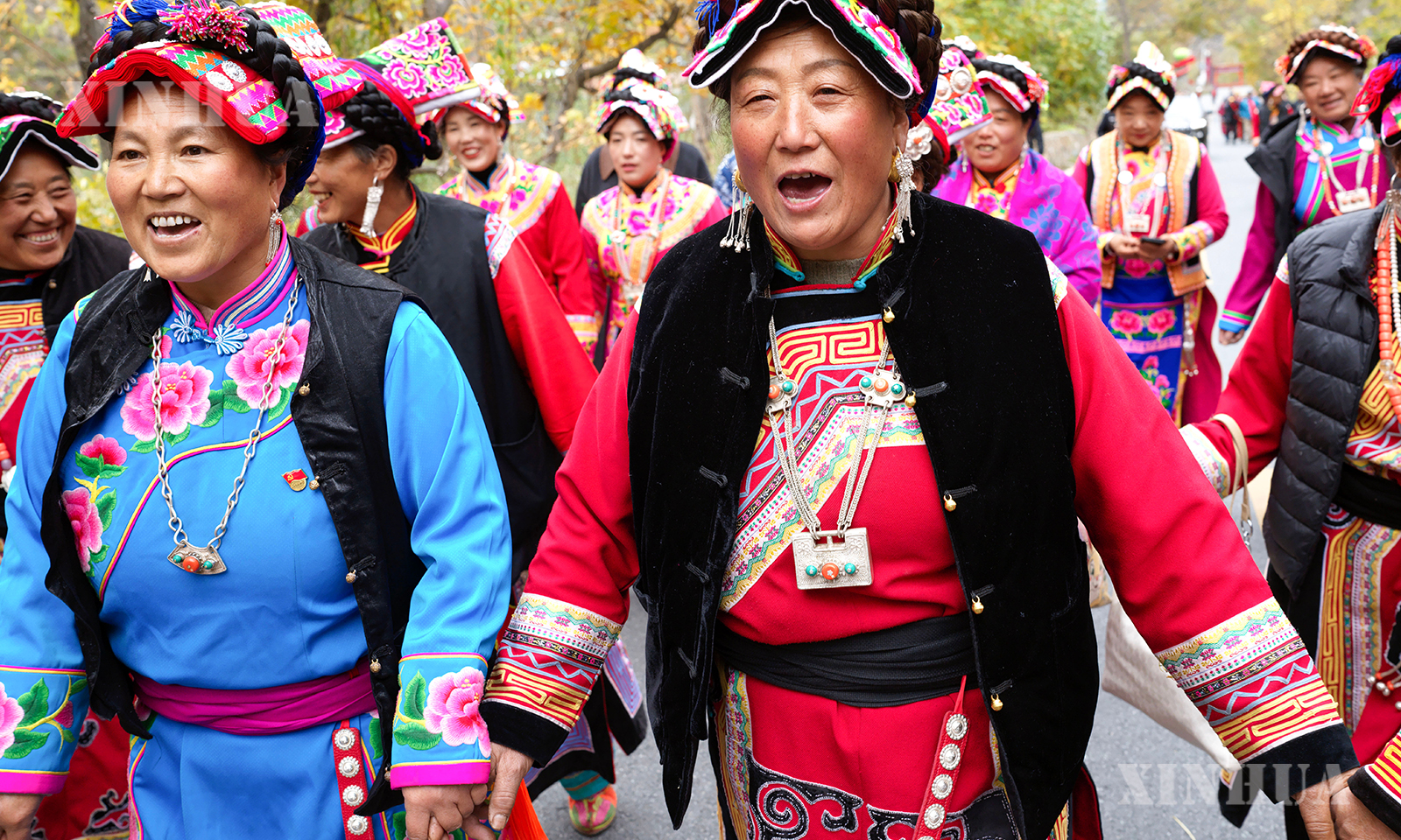 图说2:11月18日,在茂县赤不苏镇,当地羌族妇女身着传统服饰聚集在一起,迎接羌年的到来。新华社发(兰红光摄)