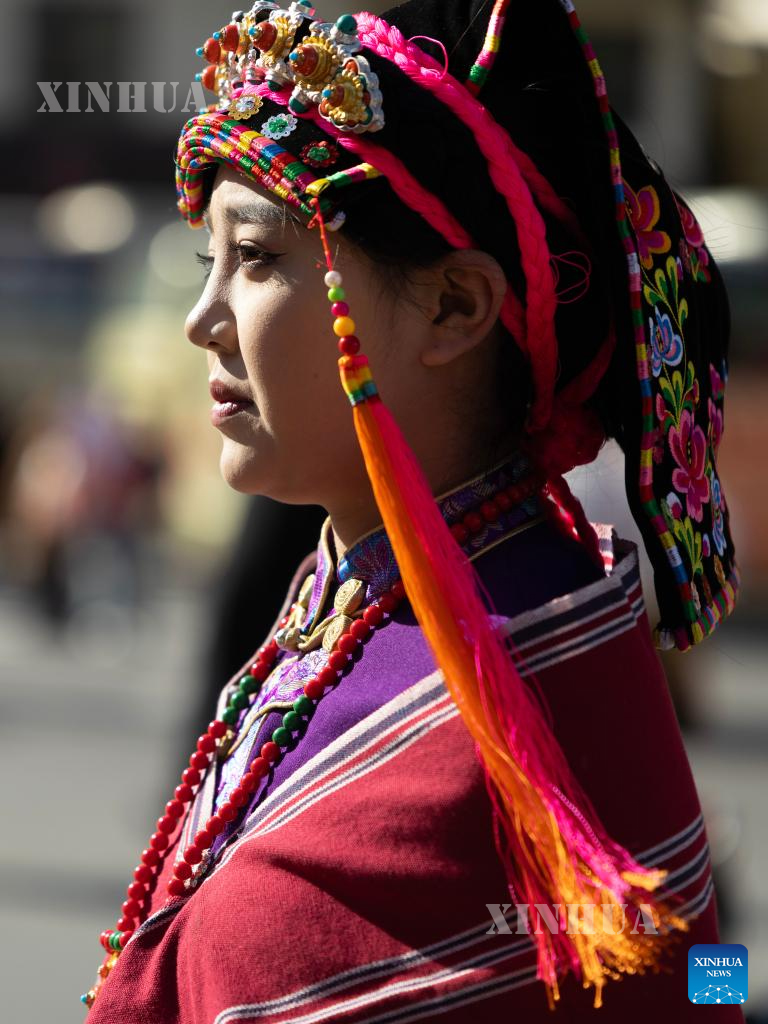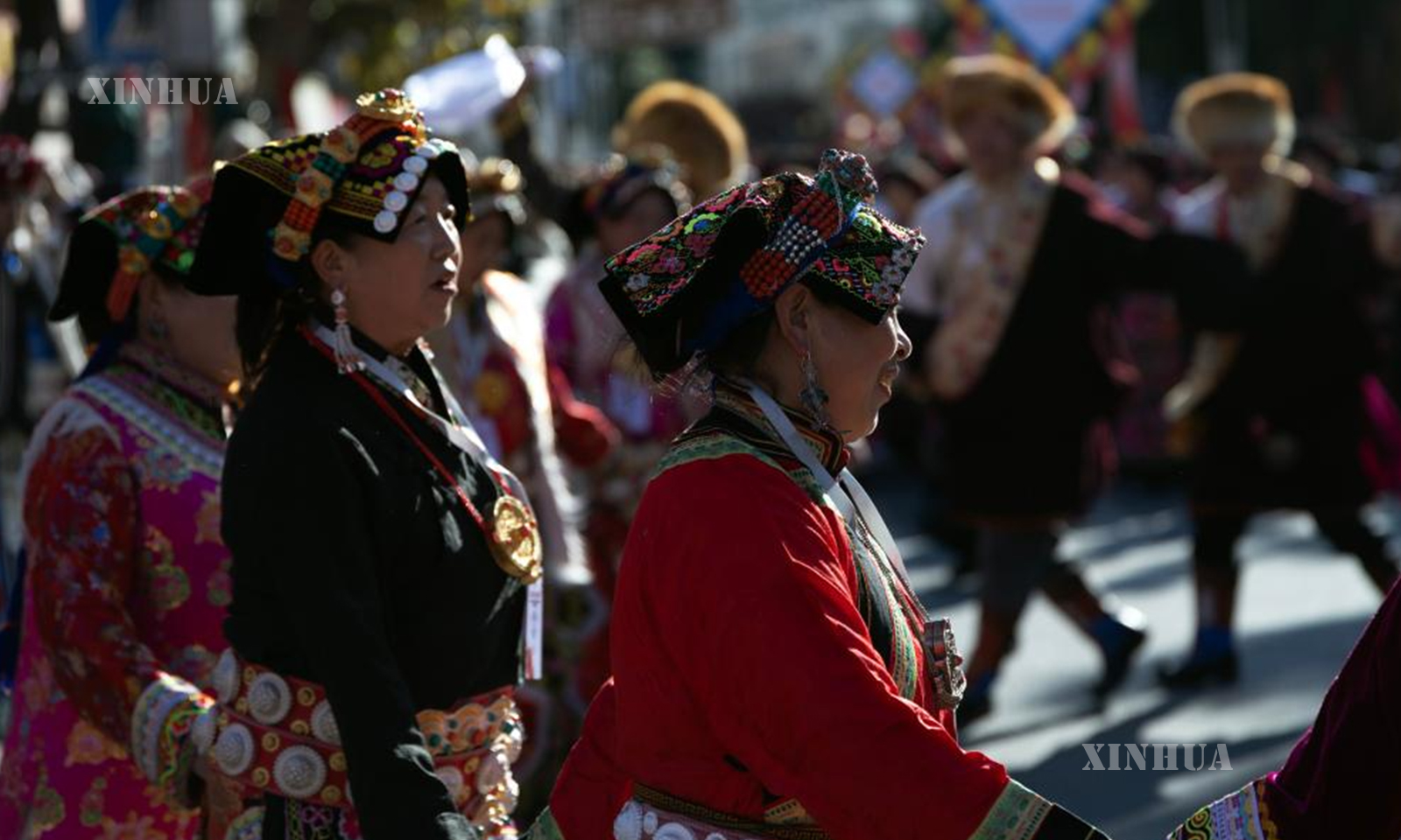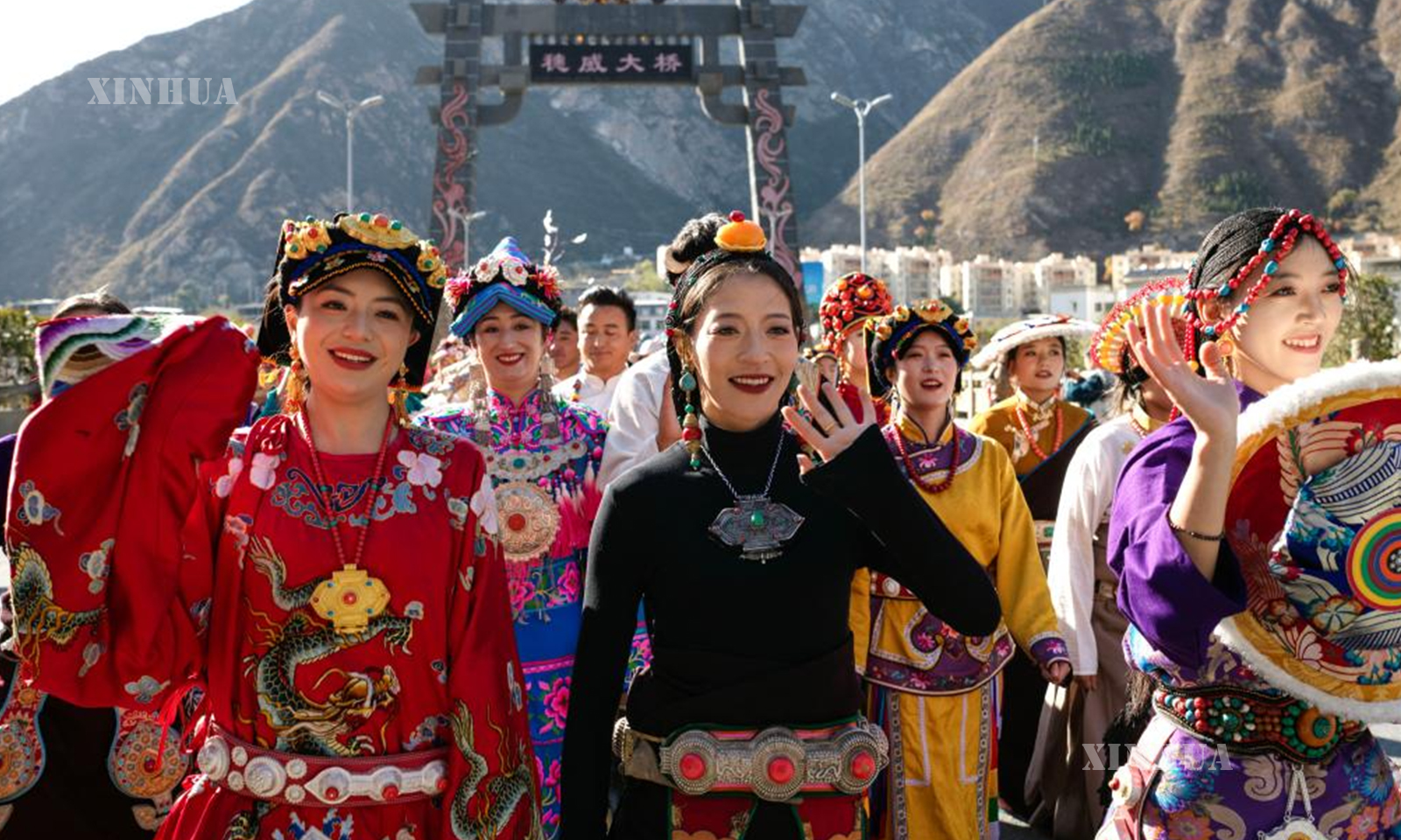 တရုတ်နိုင်ငံ အနောက်တောင်ပိုင်း စီချွမ်းပြည်နယ်အားပါ့ဇန့်လူမျိုး၊ ချန်းလူမျိုး ကိုယ်ပိုင်အုပ်ချုပ်ခွင့်ရပြည်နယ်ခွဲ့ ဝန်ချွမ်းခရိုင်၌ ချန်းနှစ်သစ်ကူးပွဲတော်အခမ်းအနားတစ်ခုအတွင်း ဖျော်ဖြေတင်ဆက်နေသည့် ချန်း လူမျိုးဝတ်စုံဝတ်ဆင်ထားသော အမျိုးသမီးများကို ၂၀၂၅ ခုနှစ် နိုဝင်ဘာ ၁၉ ရက်က တွေ့ရစဉ် (ဆင်ဟွာ)