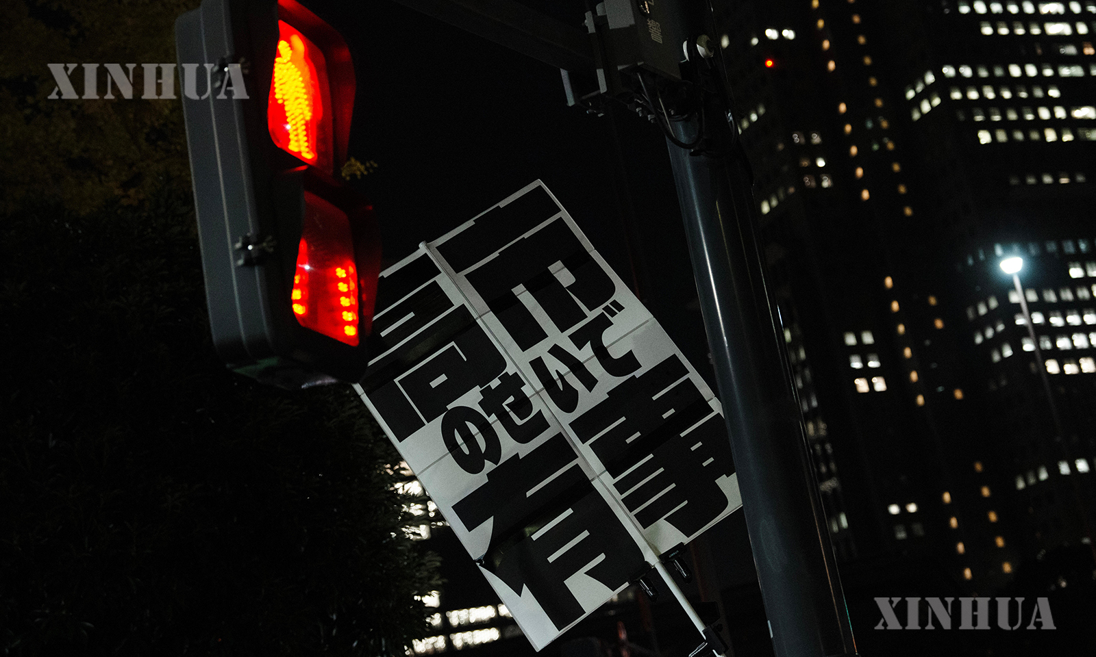 图说2:11月21日,在日本东京的首相官邸外,民众举起标语参加抗议活动。新华社记者 贾浩成 摄