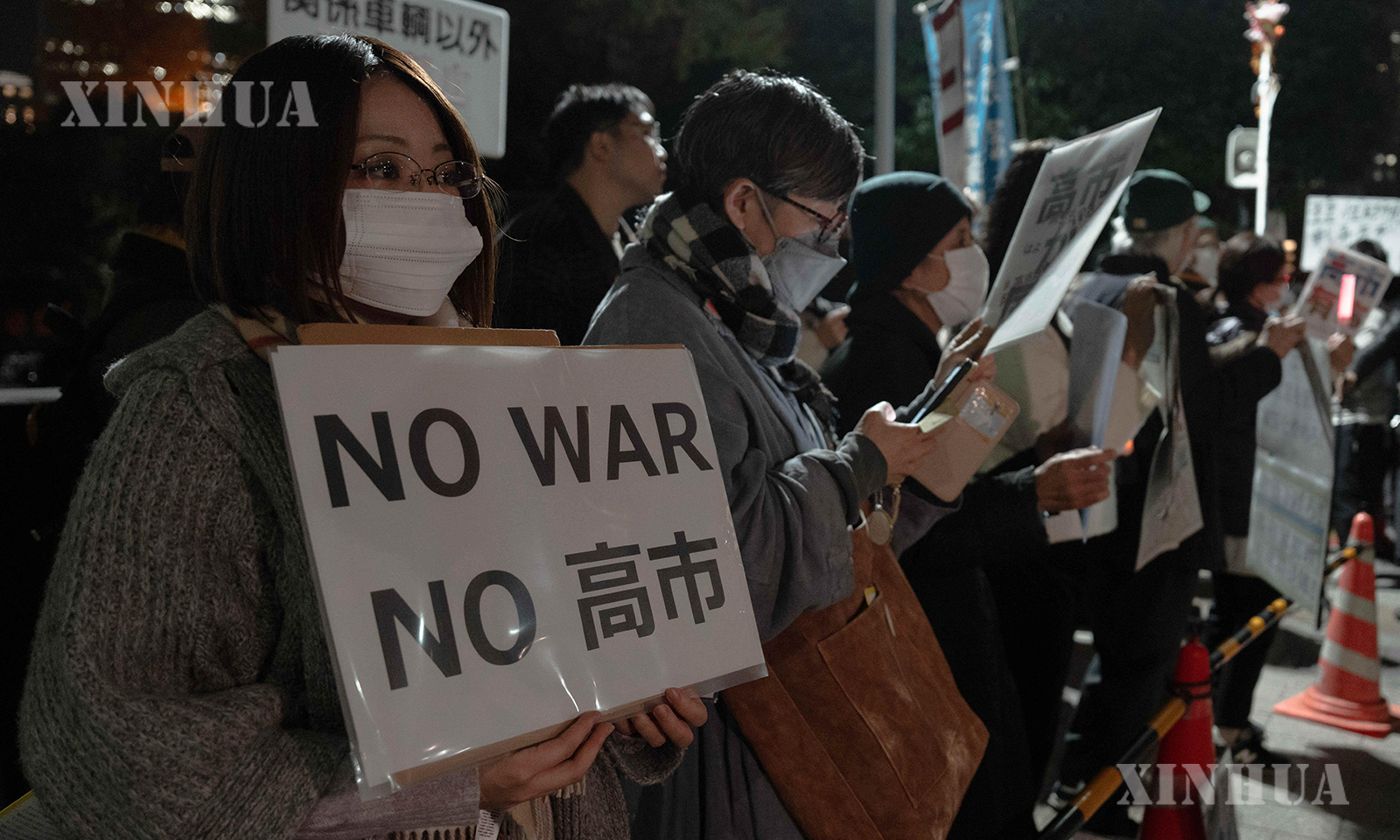 ဂျပန်နိုင်ငံ တိုကျိုမြို့ရှိ ဝန်ကြီးချုပ်အိမ်တော်အပြင်၌ ဆိုင်းဘုတ်များကိုင်ဆောင်ကာ ဆန္ဒပြလှုပ်ရှားမှုတွင် ပါဝင်သောပြည်သူများကို ၂၀၂၅ ခုနှစ် နိုဝင်ဘာ ၂၁ ရက်က တွေ့ရစဉ် (ဆင်ဟွာ)