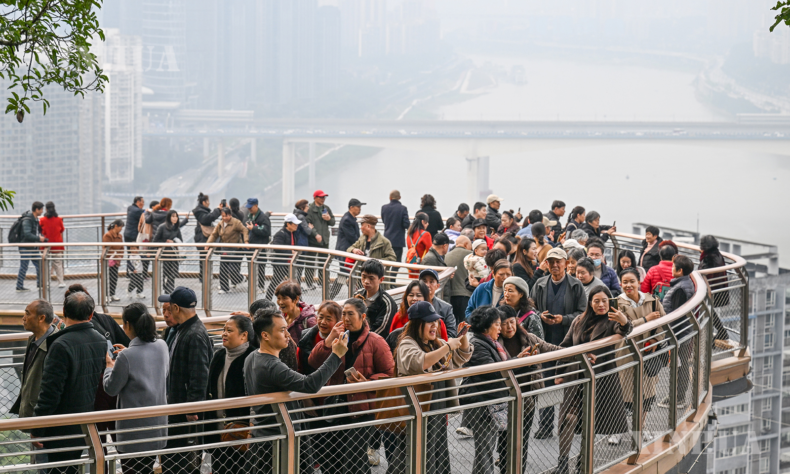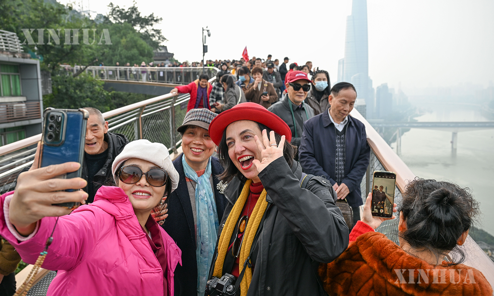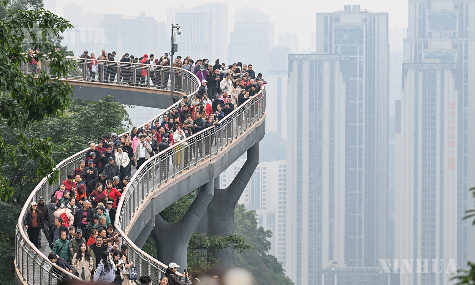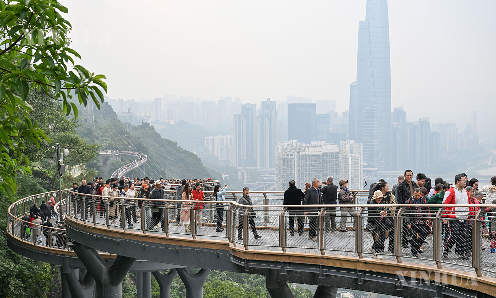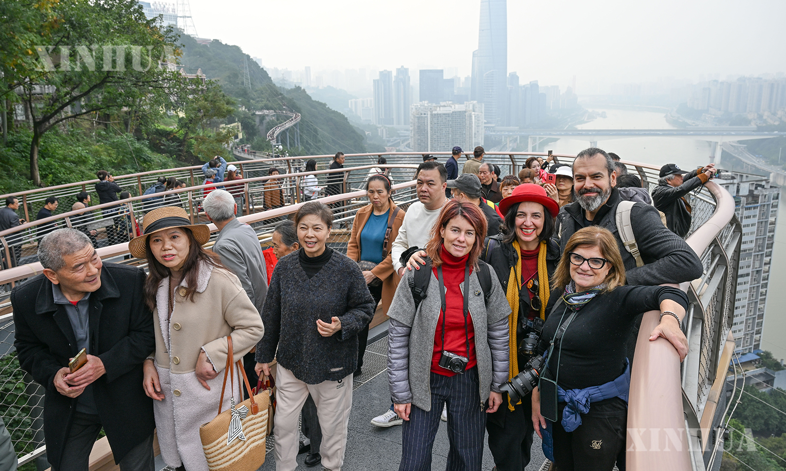 တရုတ်နိုင်ငံ ချုံချင့်မြို့ တောင်ကမ်းပါးရှိ အယ်လျင် လျှောက်လမ်းတံတားတွင် လည်ပတ်၍ အမှတ်တရဓာတ်ပုံ ရိုက်ကူးနေသူများကို ၂၀၂၅ ခုနှစ် နိုဝင်ဘာ ၂၄ ရက်က တွေ့ရစဉ် (ဆင်ဟွာ)