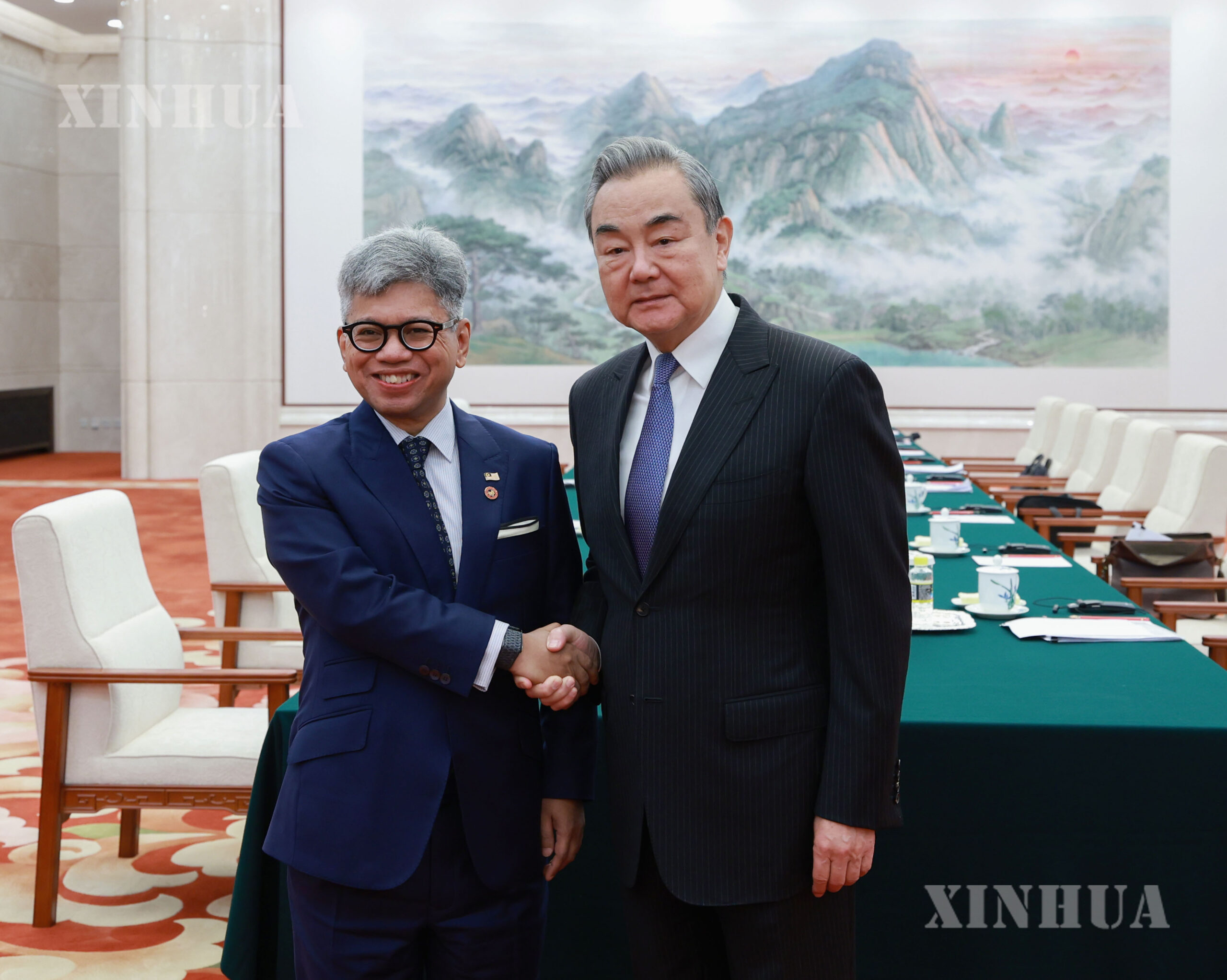 图说:11月25日,中共中央政治局委员、中央外办主任王毅在北京会见来华出席中马海上问题双边对话第二次会议的马来西亚国家安全委员会主任努西尔万。 新华社记者 王晔 摄