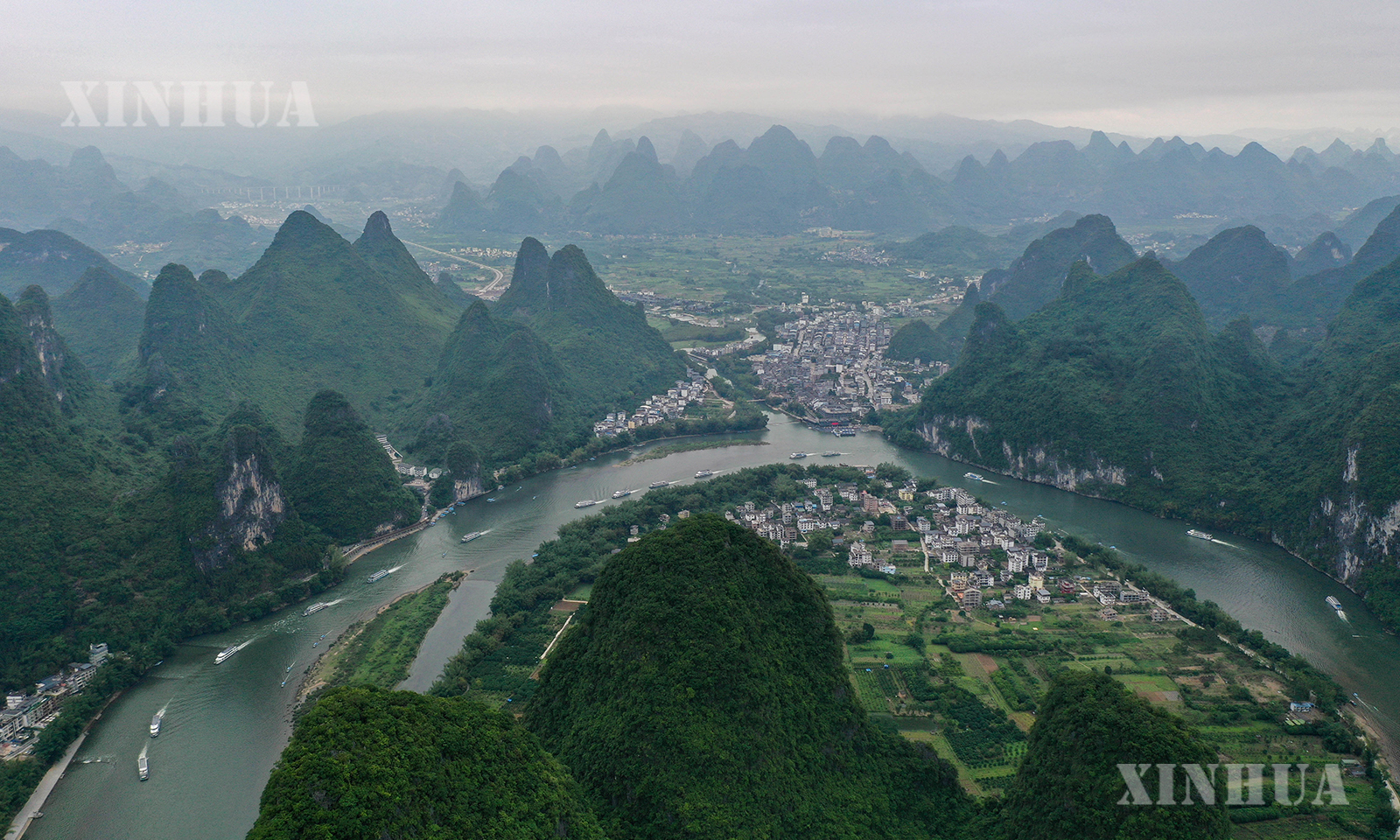图说2:这是群山环绕的桂林市阳朔县兴坪镇乡村(无人机照片,2021年4月25日摄)。新华社发(郑昌昊 摄)
