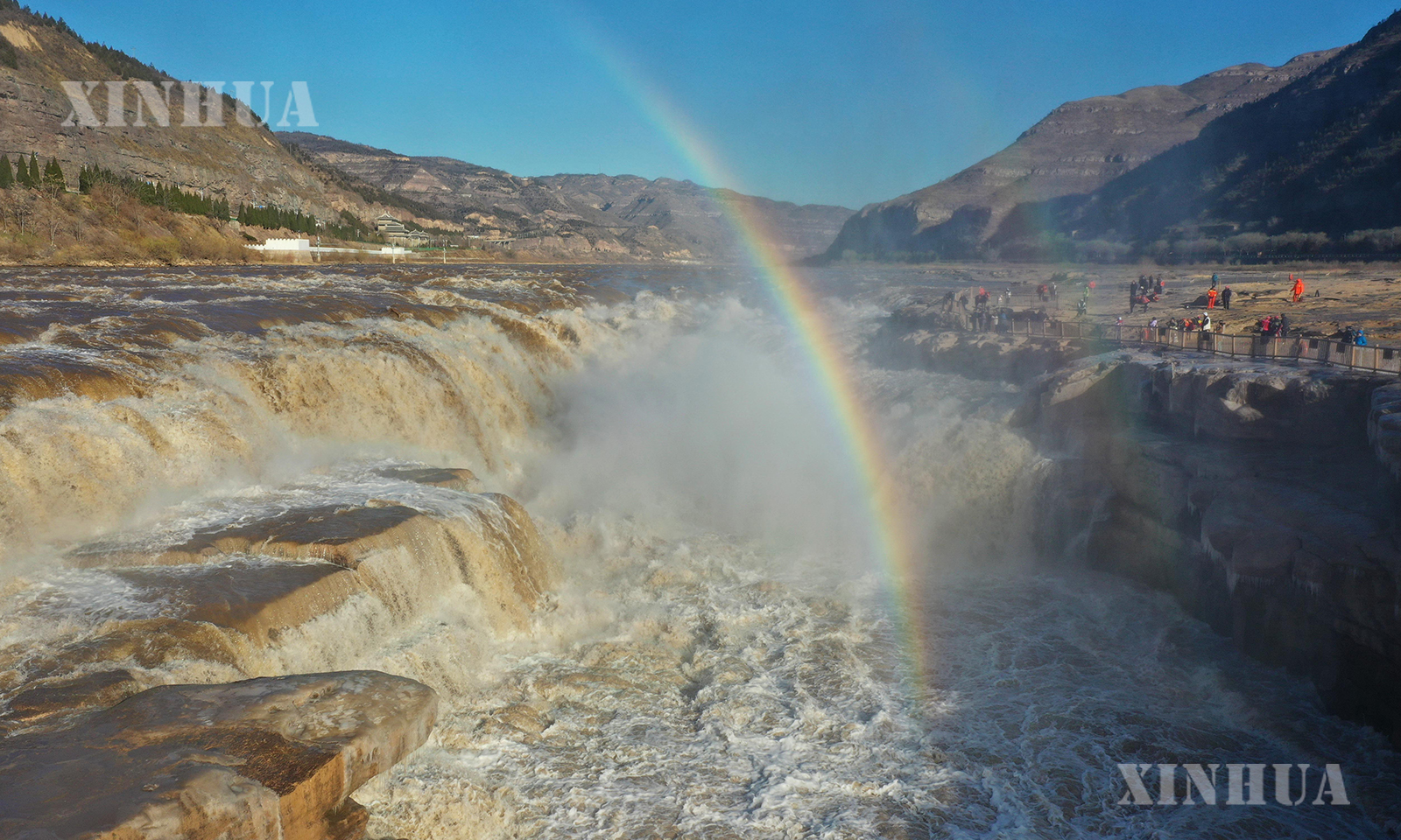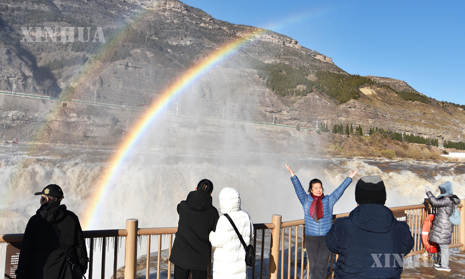 တရုတ်နိုင်ငံ ဆန်းရှီးပြည်နယ် ကျီရှန့်ခရိုင် မြစ်ဝါမြစ် ဟူခိုရေတံခွန်၌ “သက်တံနှစ်ထပ်” ရှုမြင်ကွင်းအား ရှုစားနေသော ခရီးသွားဧည့်သည်များကို ၂၀၂၅ ခုနှစ် ဒီဇင်ဘာ ၃ ရက်က တွေ့ရစဉ် (ဆင်ဟွာ)