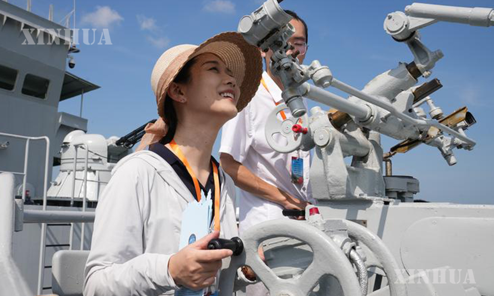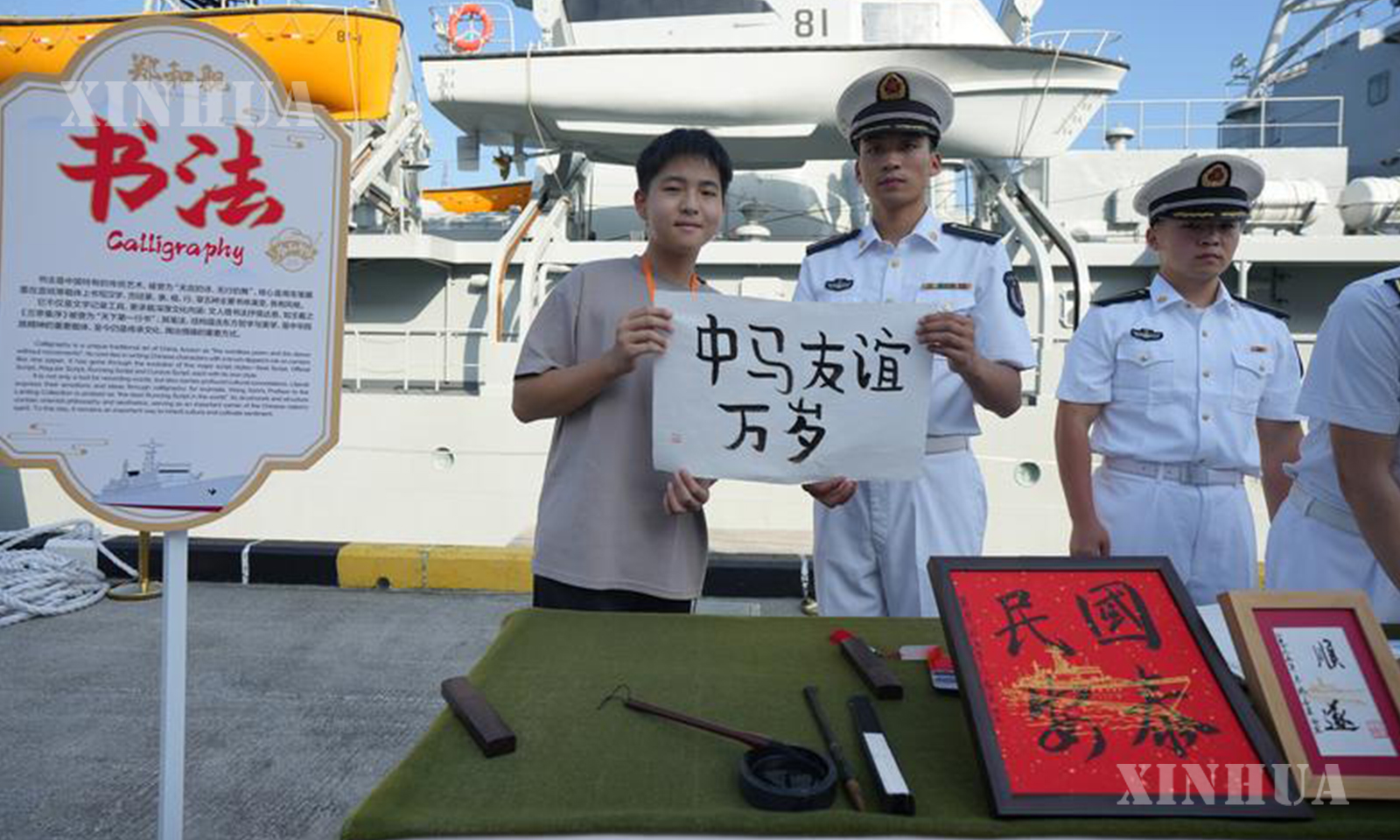 မလေးရှားနိုင်ငံ ကလန်ဆိပ်ကမ်း၌ တရုတ်ရေတပ် အမှတ် ၉၈၉ တပ်ဖွဲ့ စီစဉ်ကျင်းပသော သင်္ဘောပေါ်သို့ အများပြည်သူလာရောက်ကြည့်ရှုရေးအစီအစဉ်တွင် ပါဝင်ကြည့်ရှုသူတစ်ဦးက လက်ရေးလှအား ပြသနေသည်ကို ၂၀၂၅ ခုနှစ် ဒီဇင်ဘာ ၁ ရက်က တွေ့ရစဉ် (ဆင်ဟွာ)