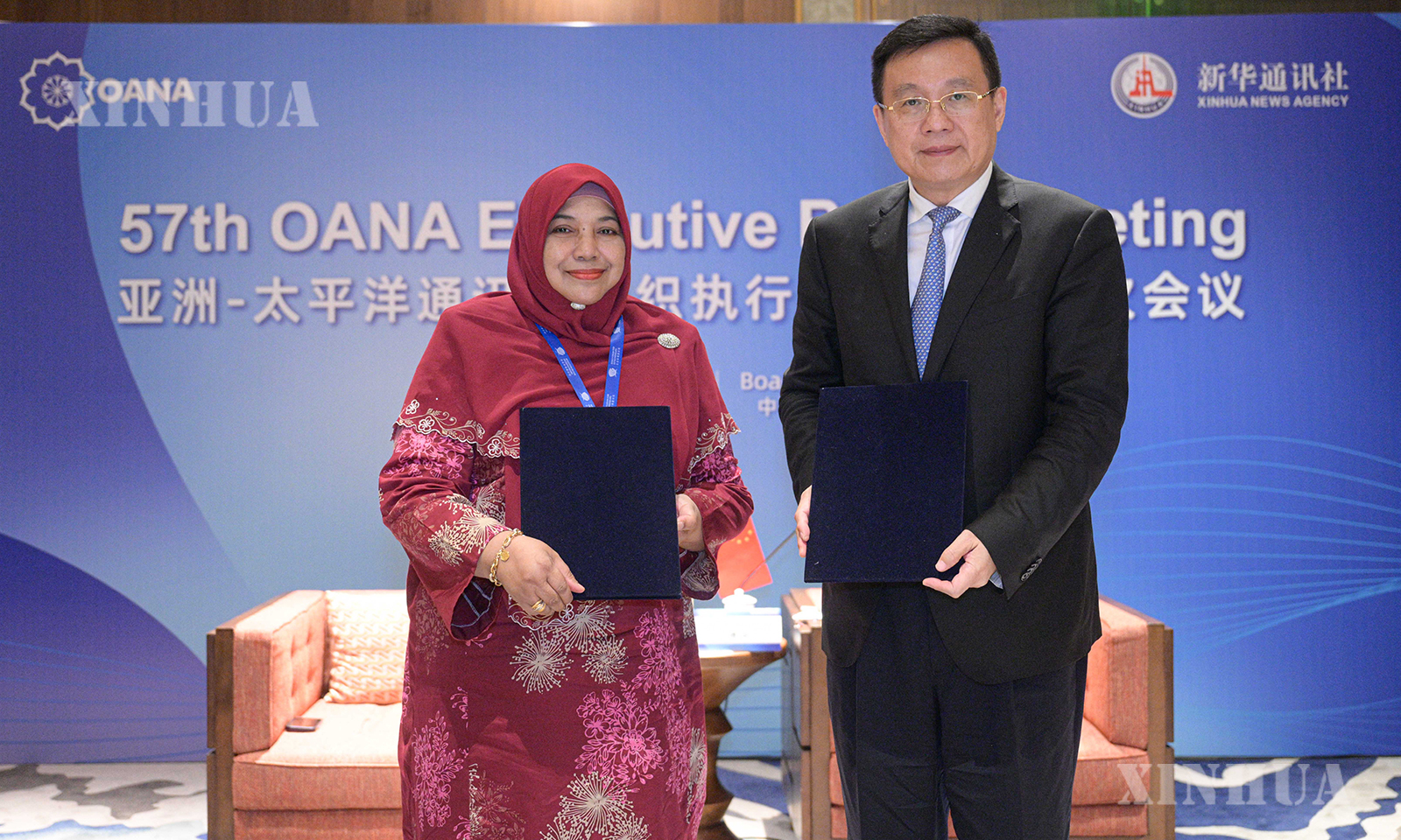 တရုတ်နိုင်ငံ ဟိုင်နန်ပြည်နယ် ဘိုးအောက်မြို့တွင် ဆင်ဟွာသတင်းဌာန ဥက္ကဋ္ဌ ဖုဟွာနှင့် တရုတ်နိုင်ငံသို့လာရောက်၍ ၅၇ ကြိမ်မြောက် အာရှပစိဖိတ် သတင်းဌာနအဖွဲ့ (OANA) အမှုဆောင်အဖွဲ့ အစည်းအဝေး တက်ရောက်သော မလေးရှားနိုင်ငံ အမျိုးသားသတင်းအေဂျင်စီ (Bernama) အမှုဆောင်အရာရှိချုပ် Nur-ul Afida Binti Kamaludin တို့က နှစ်ဖက်ချုပ်ဆိုထားသော သတင်းအချက်အလက် ဖြန့်ချိရေးကဏ္ဍ ပူးပေါင်းဆောင်ရွက်မှု နားလည်မှုစာချွန်လွှာ လဲလှယ်နေသည်ကို ၂၀၂၅ ခုနှစ် ဒီဇင်ဘာ ၃ ရက်က တွေ့ရစဉ် (ဆင်ဟွာ)