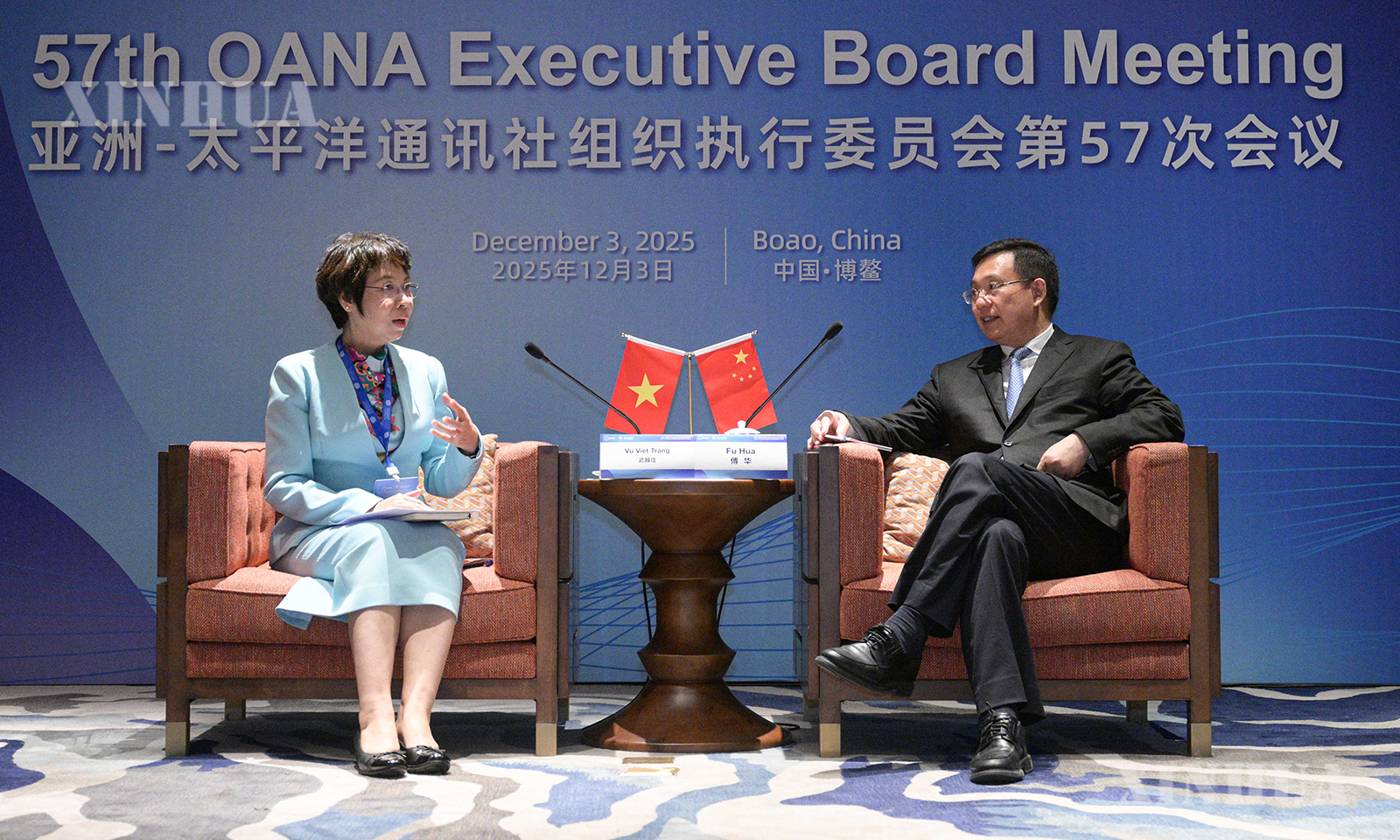 တရုတ်နိုင်ငံ ဟိုင်နန်ပြည်နယ် ဘိုးအောက်မြို့တွင် ဆင်ဟွာသတင်းဌာန ဥက္ကဋ္ဌ ဖုဟွာနှင့် တရုတ်နိုင်ငံသို့လာရောက်၍ ၅၇ ကြိမ်မြောက် အာရှပစိဖိတ် သတင်းဌာနအဖွဲ့ (OANA) အမှုဆောင်အဖွဲ့ အစည်းအဝေး တက်ရောက်သော ဗီယက်နမ်နိုင်ငံ သတင်းဌာန (VNA) အကြီးအကဲ Vu Viet Trang တို့ ၂၀၂၅ ခုနှစ် ဒီဇင်ဘာ ၃ ရက်က တွေ့ဆုံနေစဉ် (ဆင်ဟွာ)
