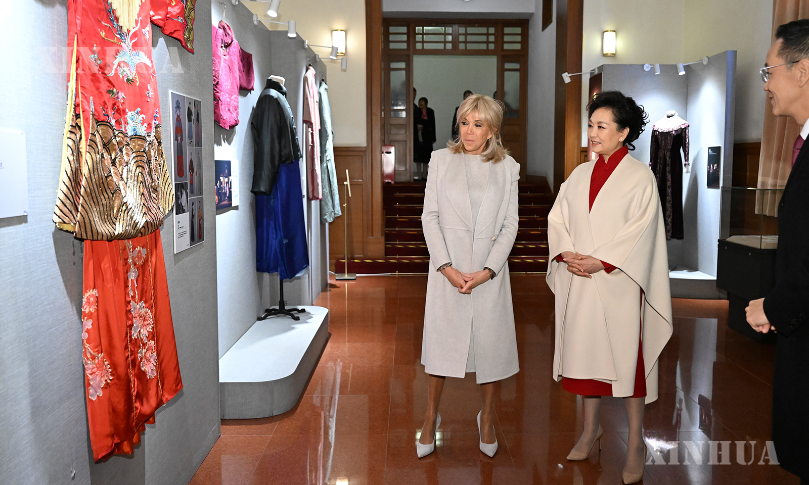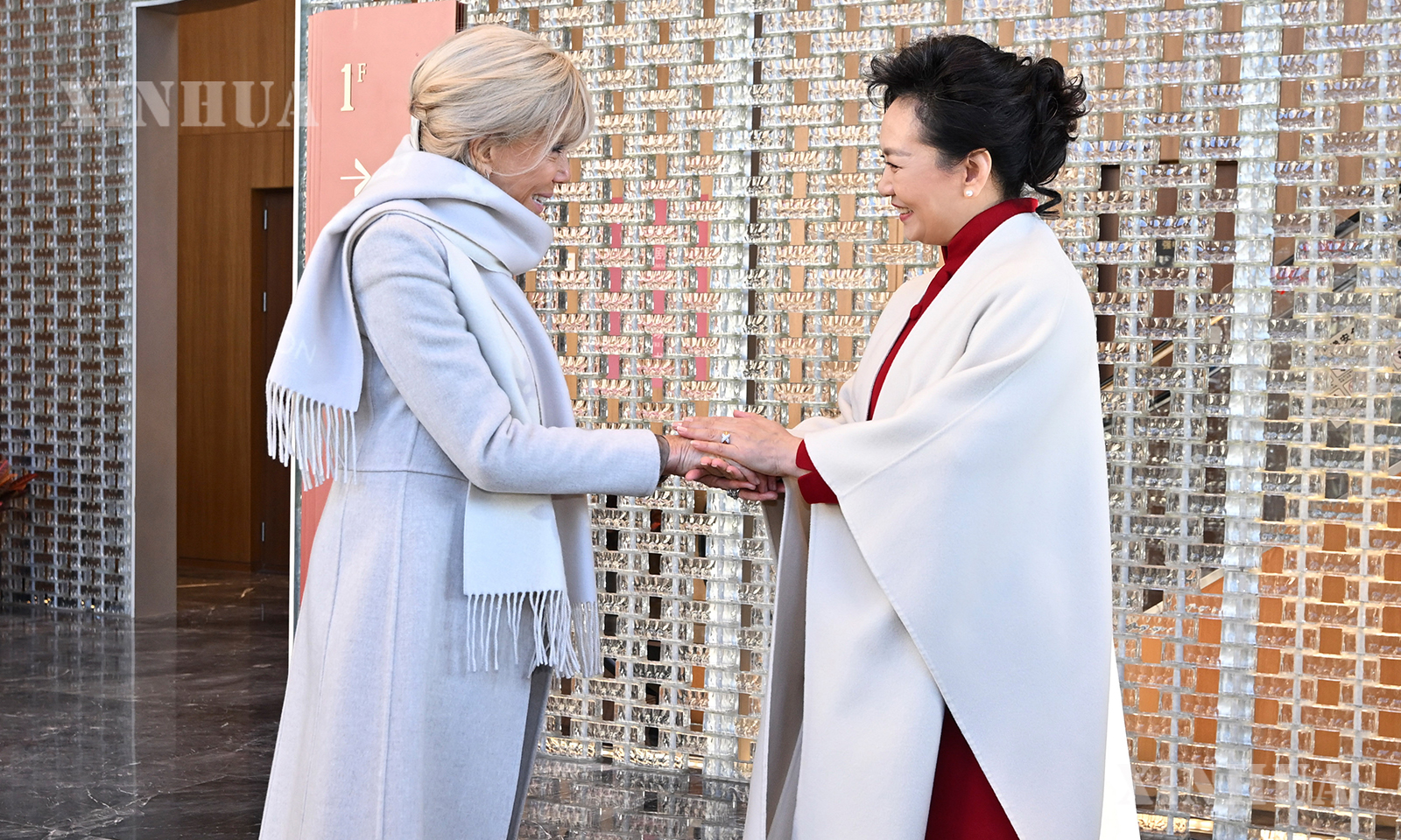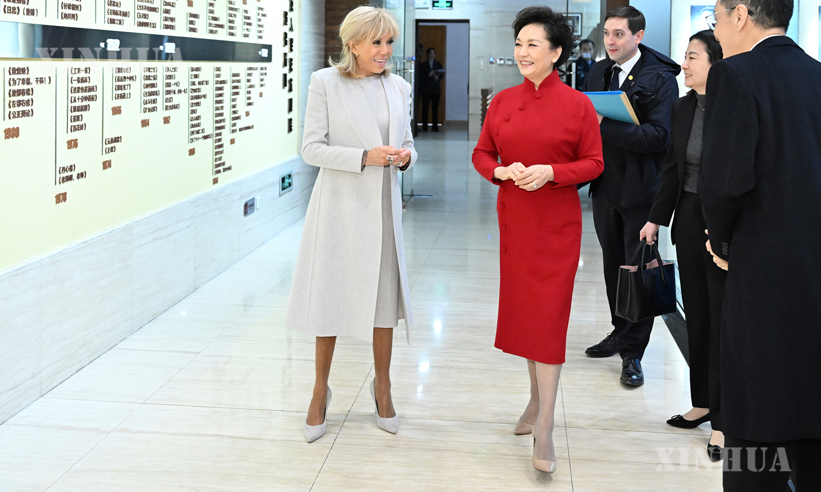 ဖုန်လိယွမ်နှင့် ပြင်သစ်နိုင်ငံ သမ္မတ၏ ဇနီး Brigitte Macron တို့ ပေကျင်းပြည်သူ့အနုပညာဇာတ်ရုံအား အတူလေ့လာကြည့်ရှု