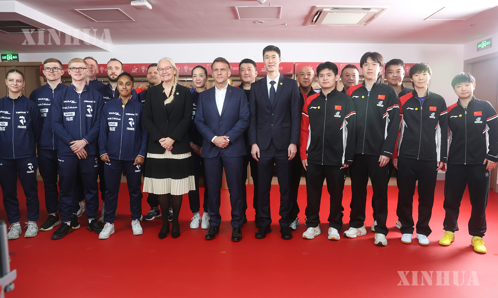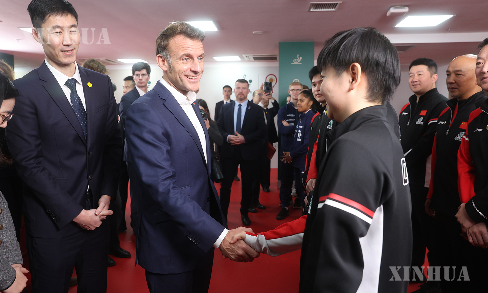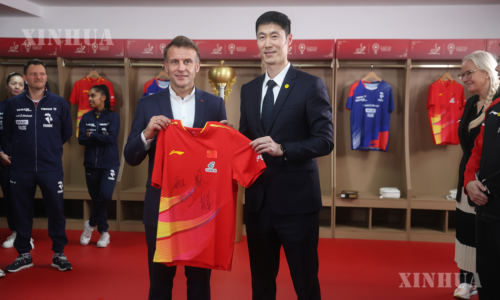 ပြင်သစ်နိုင်ငံ သမ္မတ မက်ခရွန်သည် တရုတ်နိုင်ငံ ချိန်တူးမြို့ရှိ စီချွမ်းပြည်နယ် အားကစားရုံသို့ သွားရောက်၍ ချိန်တူးမြို့၌ ၂၀၂၅ ခုနှစ် နိုင်ငံတကာ စားပွဲတင်တင်းနစ်အဖွဲ့ချုပ် (ITTF) ကျားမအဖွဲ့လိုက် ကမ္ဘာ့ဖလားပြိုင်ပွဲတွင် ပါဝင်ယှဉ်ပြိုင်နေသည့် တရုတ်-ပြင်သစ် နှစ်နိုင်ငံ အားကစားသမားများနှင့် အပြန်အလှန် ပြောဆိုဖလှယ်ခဲ့ရာ တရုတ်အသင်းက လက်ဆောင်ပေးသော အားကစားအင်္ကျီအား မက်ခရွန် လက်ခံနေသည်ကို ၂၀၂၅ ခုနှစ် ဒီဇင်ဘာ ၅ ရက်က တွေ့ရစဉ် (ဆင်ဟွာ)