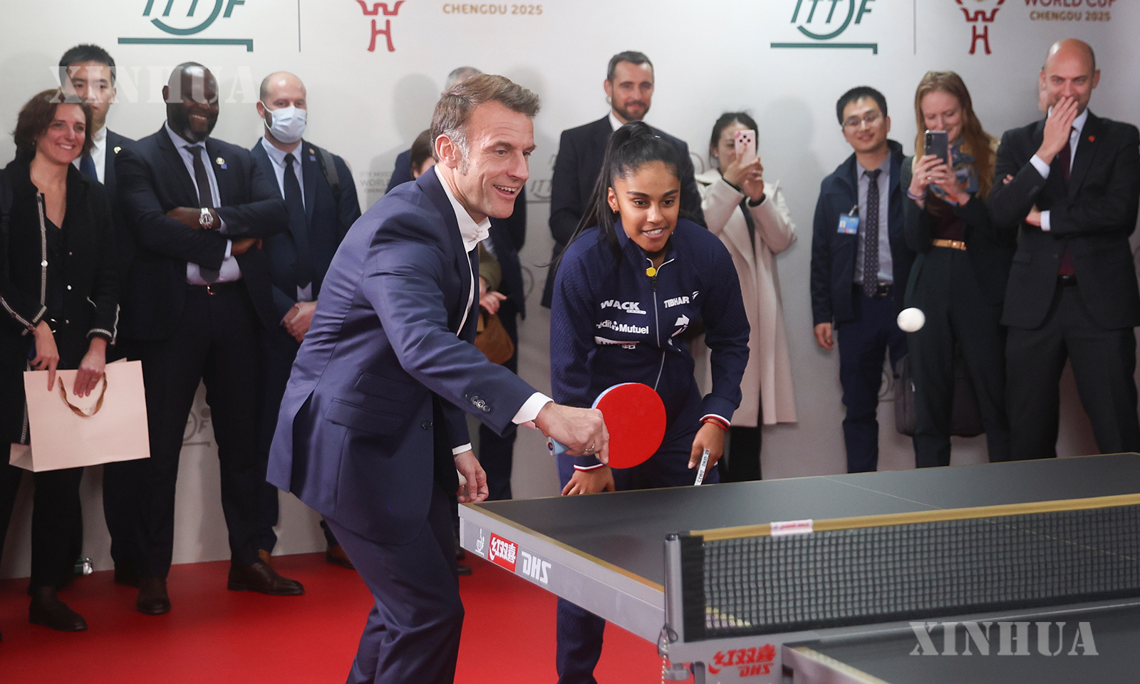 图说1:12月5日,法国总统马克龙前往四川省体育馆,与正在成都参加2025年国际乒联混合团体世界杯的中法两国运动员互动。 新华社发(刘宇宸摄)