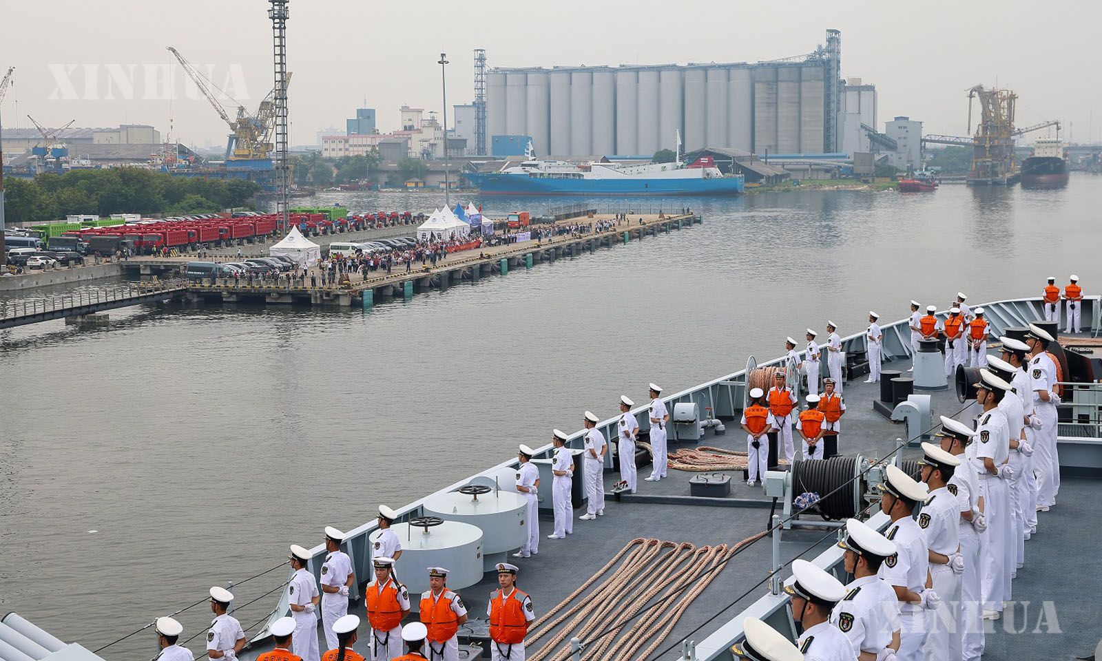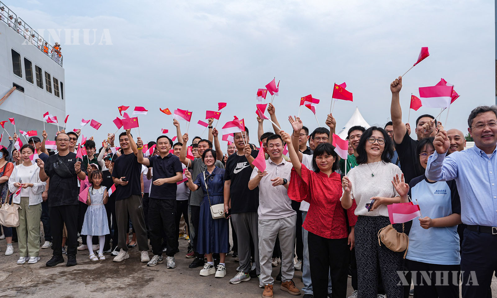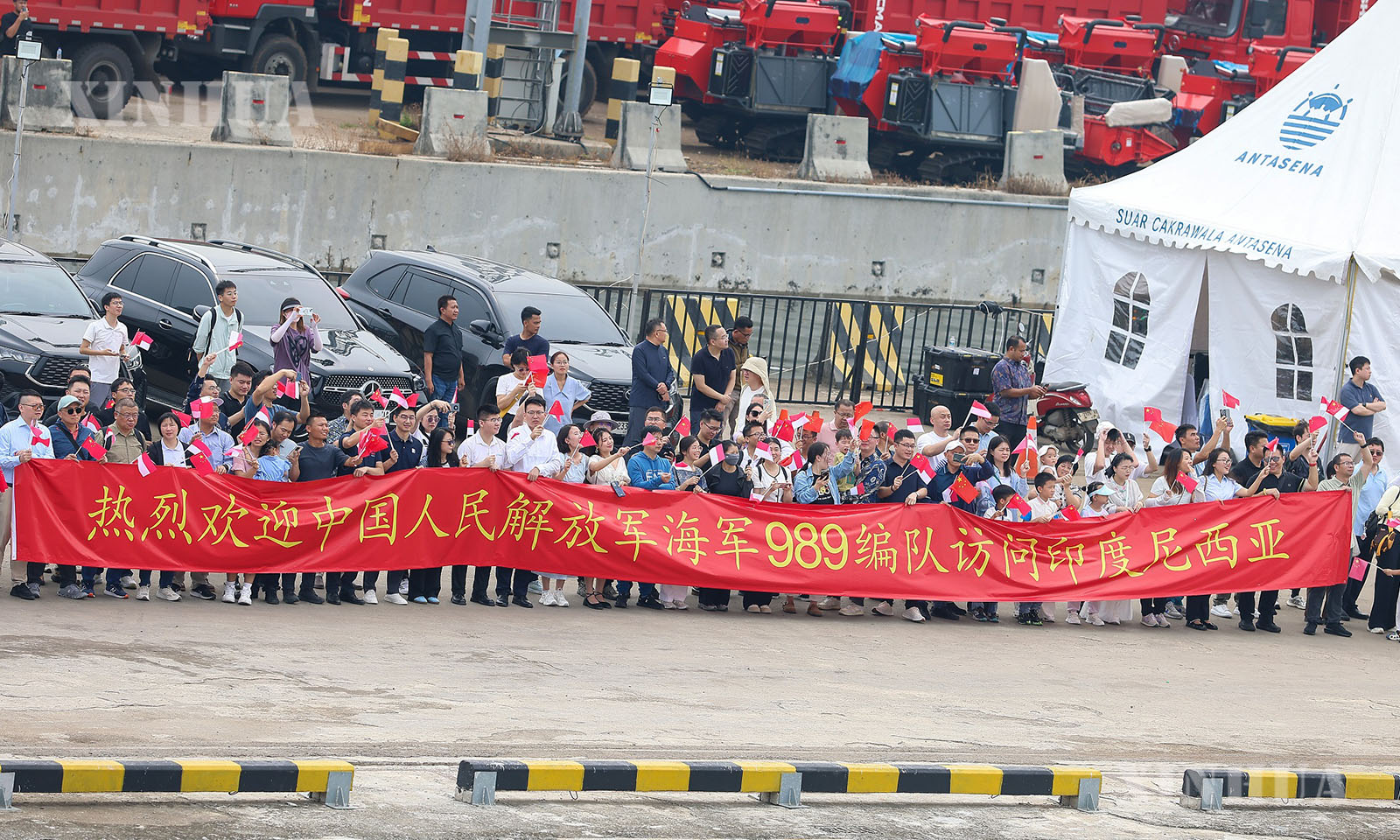 အင်ဒိုနီးရှားနိုင်ငံ ဂျကာတာမြို့ သန်ဂျွန်းပီရီရော့ (Tanjung Priok) ဆိပ်ကမ်းတွင် တရုတ်ရေတပ် အမှတ် ၉၈၉ တပ်ဖွဲ့ ရေယာဉ်များအား ကြိုဆိုနေကြသည့် လူအုပ်ကို ၂၀၂၅ ခုနှစ် ဒီဇင်ဘာ ၇ ရက်က တွေ့ရစဉ် (ဆင်ဟွာ)