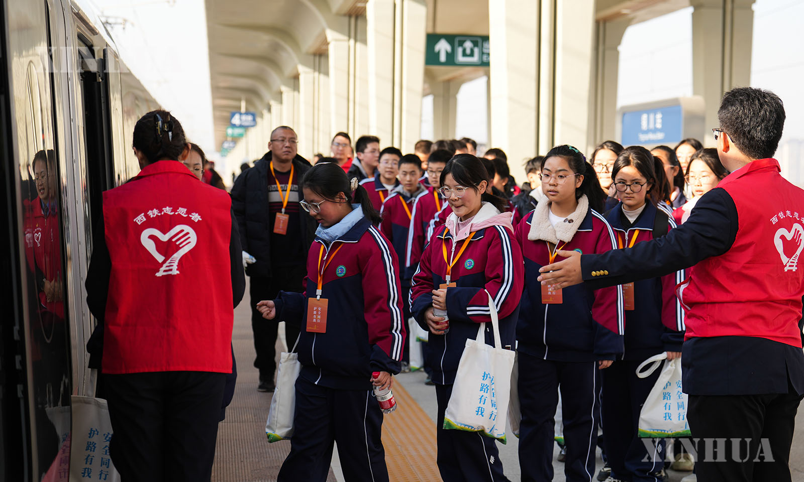 图说2:12月7日,学生代表在铜川站登乘复兴号动车组列车。 新华社发(刘翔摄)