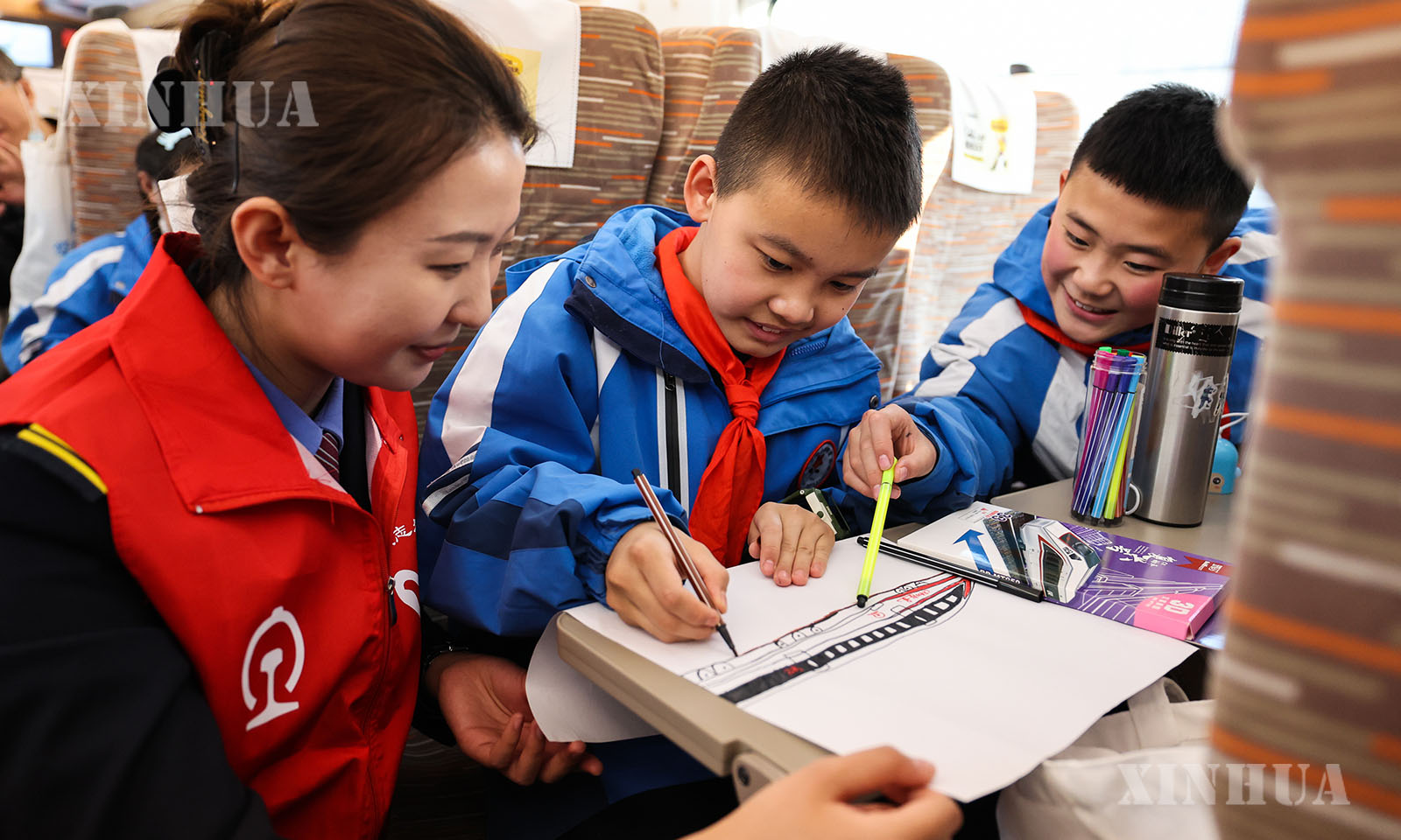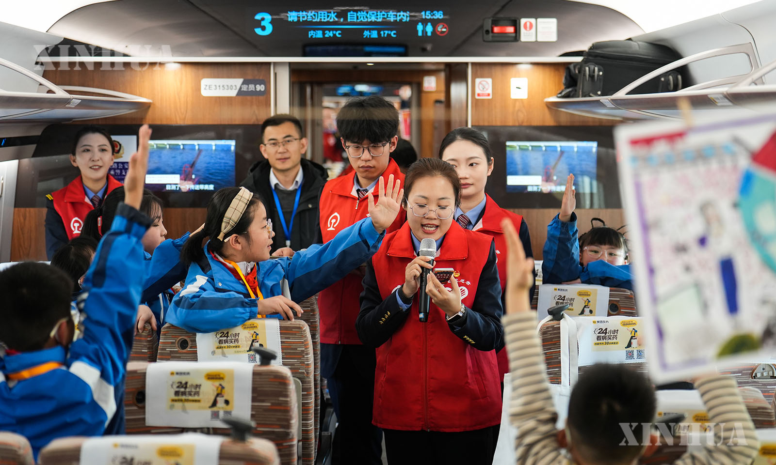 တရုတ်နိုင်ငံ ထုန်ချွမ်းဘူတာတွင် လိုက်ပါစီးနှင်ရန် Fuxing EMU ရထားပေါ် တက်နေကြသော ကျောင်းသား၊ ကျောင်းသူ ကိုယ်စားလှယ်များအား ဒီဇင်ဘာ ၇ ရက်က တွေ့ရစဉ် (ဆင်ဟွာ)