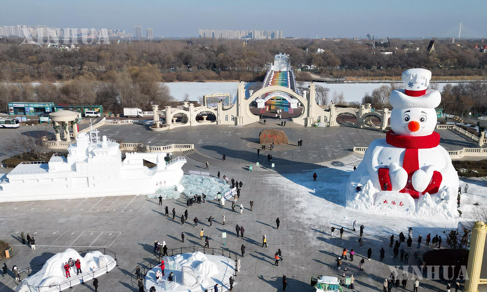 图说2:12月9日在哈尔滨太阳岛风景区拍摄的“雪人先生”(无人机照片)。新华社发(刘洋摄)