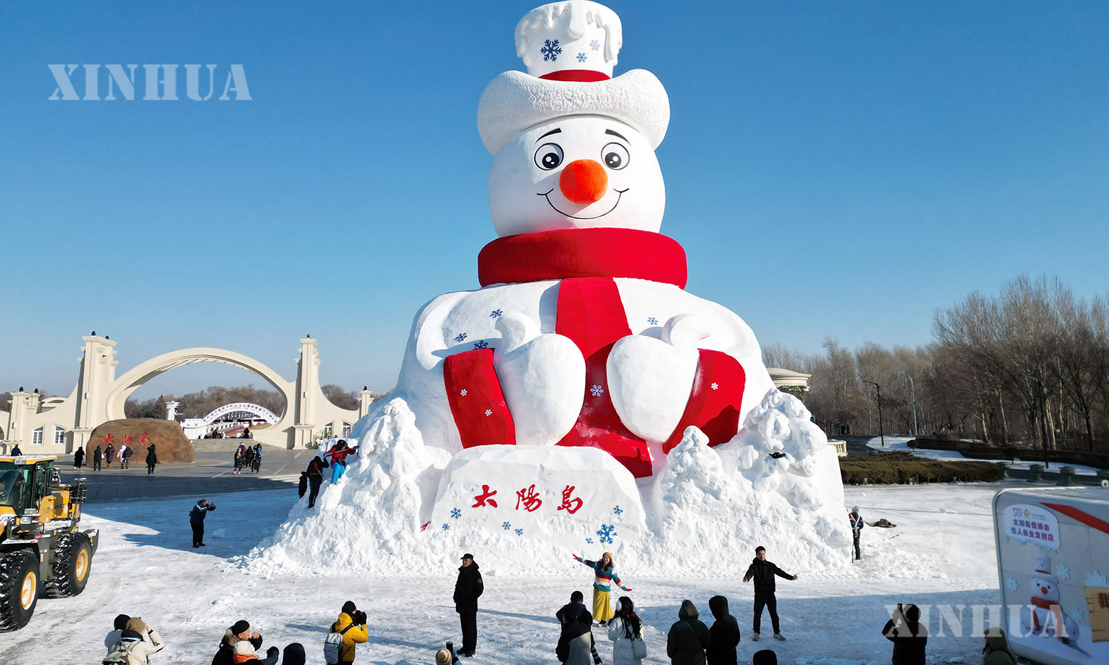图说1:12月9日,游客在“雪人先生”前留影(无人机照片)。新华社发(刘洋摄)