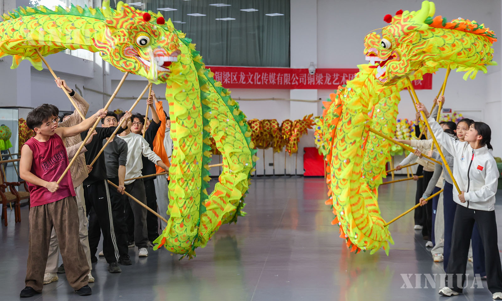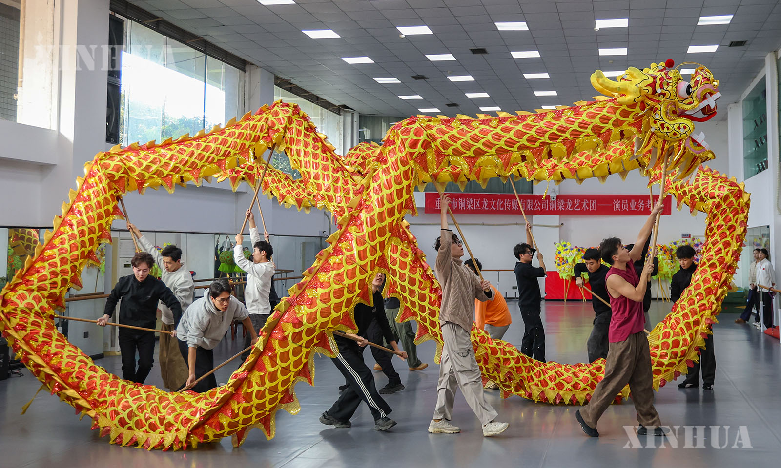 တရုတ်နိုင်ငံ ချုံချင့်မြို့ရှိ ချုံချင့်ထုန်လျန်နဂါး အနုပညာအဖွဲ့ လေ့ကျင့်ရေးခန်းအတွင်းတွင် အဖွဲ့ခေါင်းဆောင် ချိုက်မိန်ချန့်က နဂါးအကအဖွဲ့ဝင်များက ပြိုင်ပွဲဝင် နဂါးအကလေ့ကျင့်မှုအတွက် စနစ်တကျ လမ်းညွှန်ပေးနေသည်။