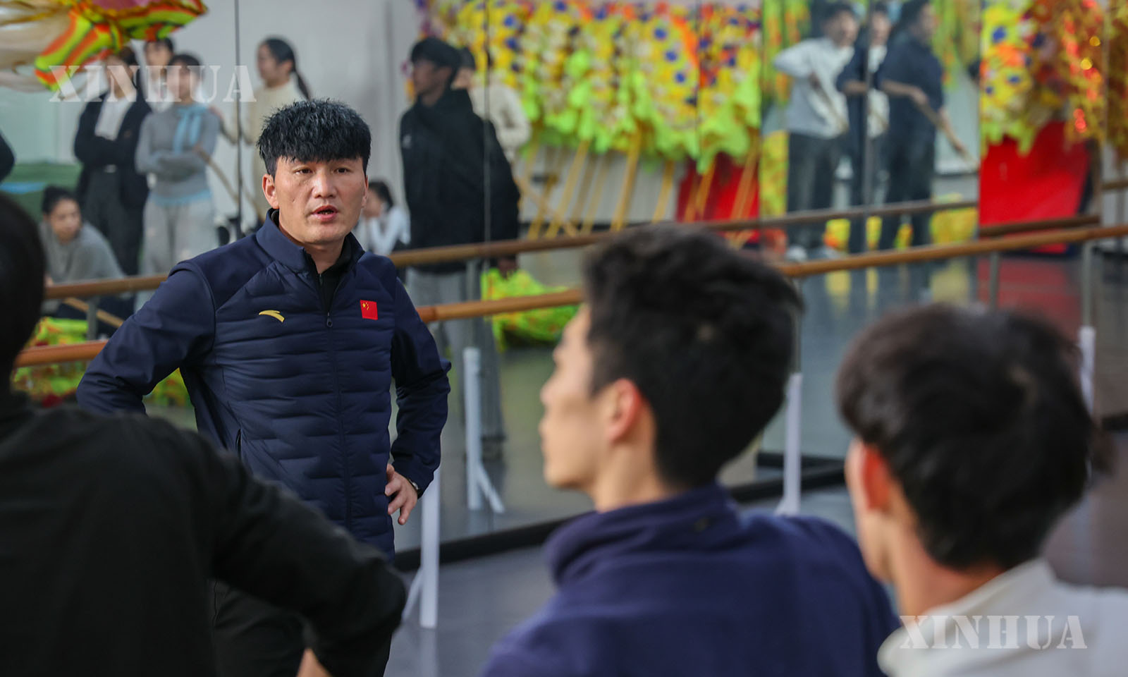 တရုတ်နိုင်ငံ ချုံချင့်မြို့ရှိ ချုံချင့်ထုန်လျန်နဂါး အနုပညာအဖွဲ့ခေါင်းဆောင် ချိုက်မိန်ချန့် (ဝဲဘက် ဒုတိယ) က ပြိုင်ပွဲဝင် နဂါးအက အဖွဲ့ဝင်များ လေ့ကျင့်မှုအား လမ်းညွှန်ပေးနေသည်ကို ၂၀၂၅ ခုနှစ် ဒီဇင်ဘာ ၇ ရက်က တွေ့ရစဉ် (ဆင်ဟွာ)