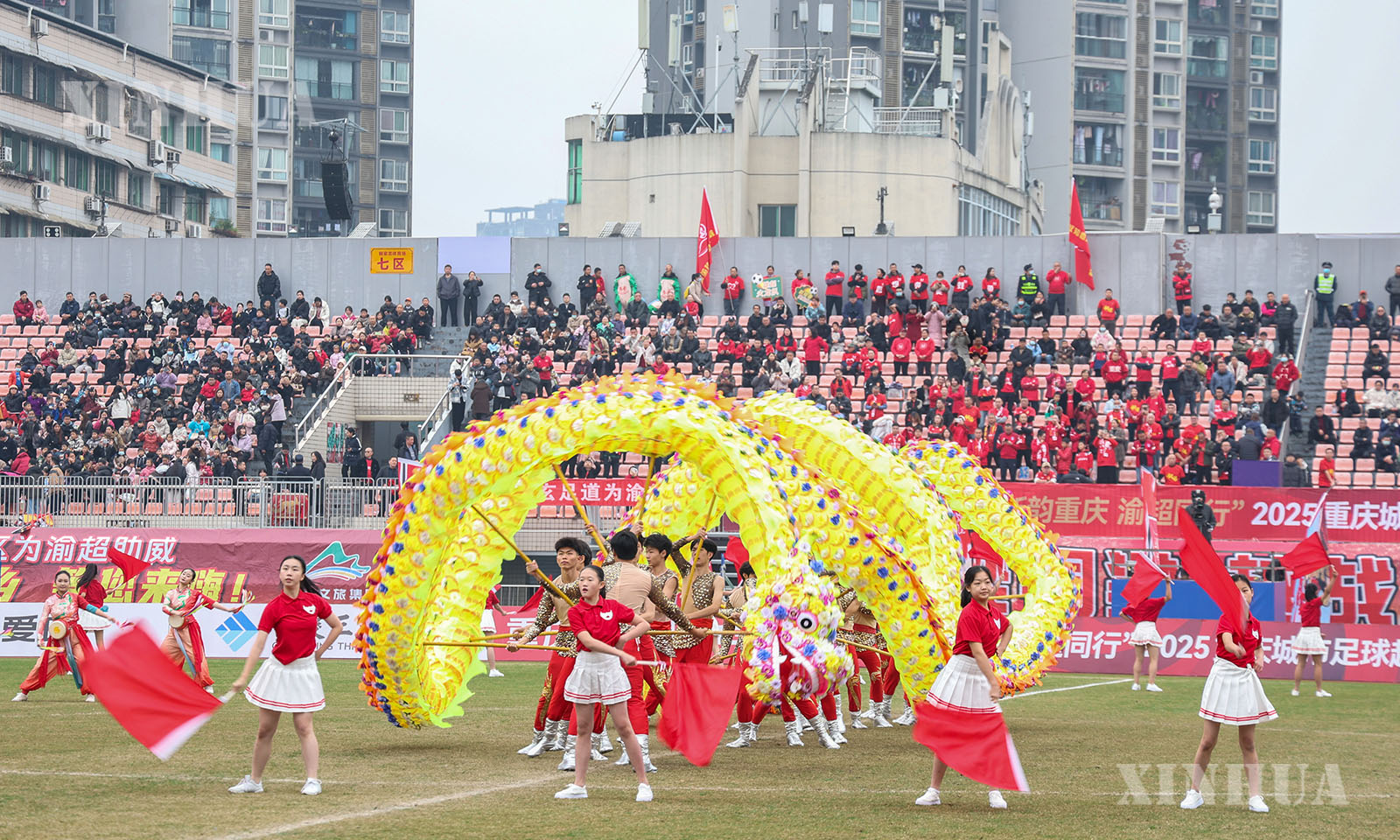 တရုတ်နိုင်ငံ ချုံချင့်မြို့ရှိ ချုံချင့်ထုန်လျန်နဂါး အနုပညာအဖွဲ့ ပြိုင်ပွဲဝင် နဂါးအက အဖွဲ့ဝင်များက ချုံချင့်ဖလား ဘောလုံးပြိုင်ပွဲတွင် ကပြဖျော်ဖြေနေသည်ကို ၂၀၂၅ ခုနှစ် ဒီဇင်ဘာ ၆ ရက်က တွေ့ရစဉ် (ဆင်ဟွာ)