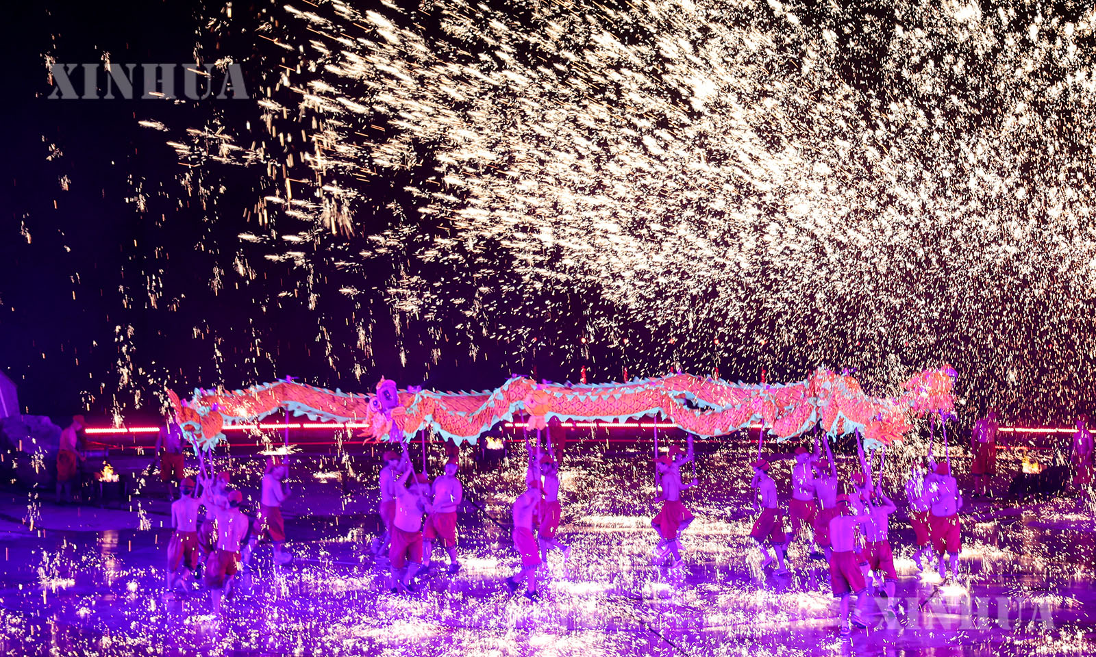 တရုတ်နိုင်ငံ ချုံချင့်မြို့ ထုန်လျန်ခရိုင် ရွှမ်ထျန်းဟူ နဂါးအကရင်ပြင်၌ “အိပ်မက်ဖော်ဆောင်သော ထုန်လျန်နဂါး” ကပြဖျော်ဖြေမှုကို ၂၀၂၅ ခုနှစ် ဒီဇင်ဘာ ၆ ရက်က တွေ့ရစဉ် (ဆင်ဟွာ)