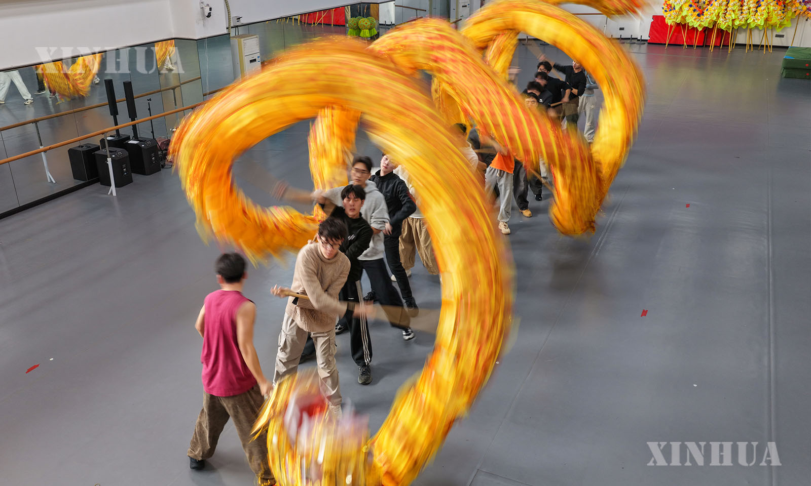 တရုတ်နိုင်ငံ ချုံချင့်မြို့ရှိ ချုံချင့်ထုန်လျန်နဂါး အနုပညာအဖွဲ့ ပြိုင်ပွဲဝင် နဂါးအက အဖွဲ့ဝင်များက ပုံမှန်လေ့ကျင့်နေသည်ကို ၂၀၂၅ ခုနှစ် ဒီဇင်ဘာ ၇ ရက်က တွေ့ရစဉ် (ဆင်ဟွာ)