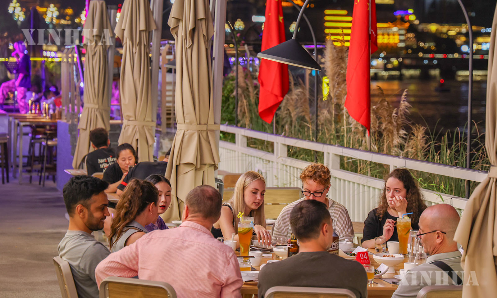 တရုတ်နိုင်ငံ ချုံချင့်မြို့ နန်အန့်ခရိုင် နန်ပင်းလမ်းတွင် ချုံချင့်အစားအစာများ သုံးဆောင်ကာ ညအလှကို ရှုစားနေကြသော နိုင်ငံခြားခရီးသွားဧည့်သည်များကို ၂၀၂၅ ခုနှစ် စက်တင်ဘာ ၃၀ ရက်က တွေ့ရစဉ် (ဆင်ဟွာ)