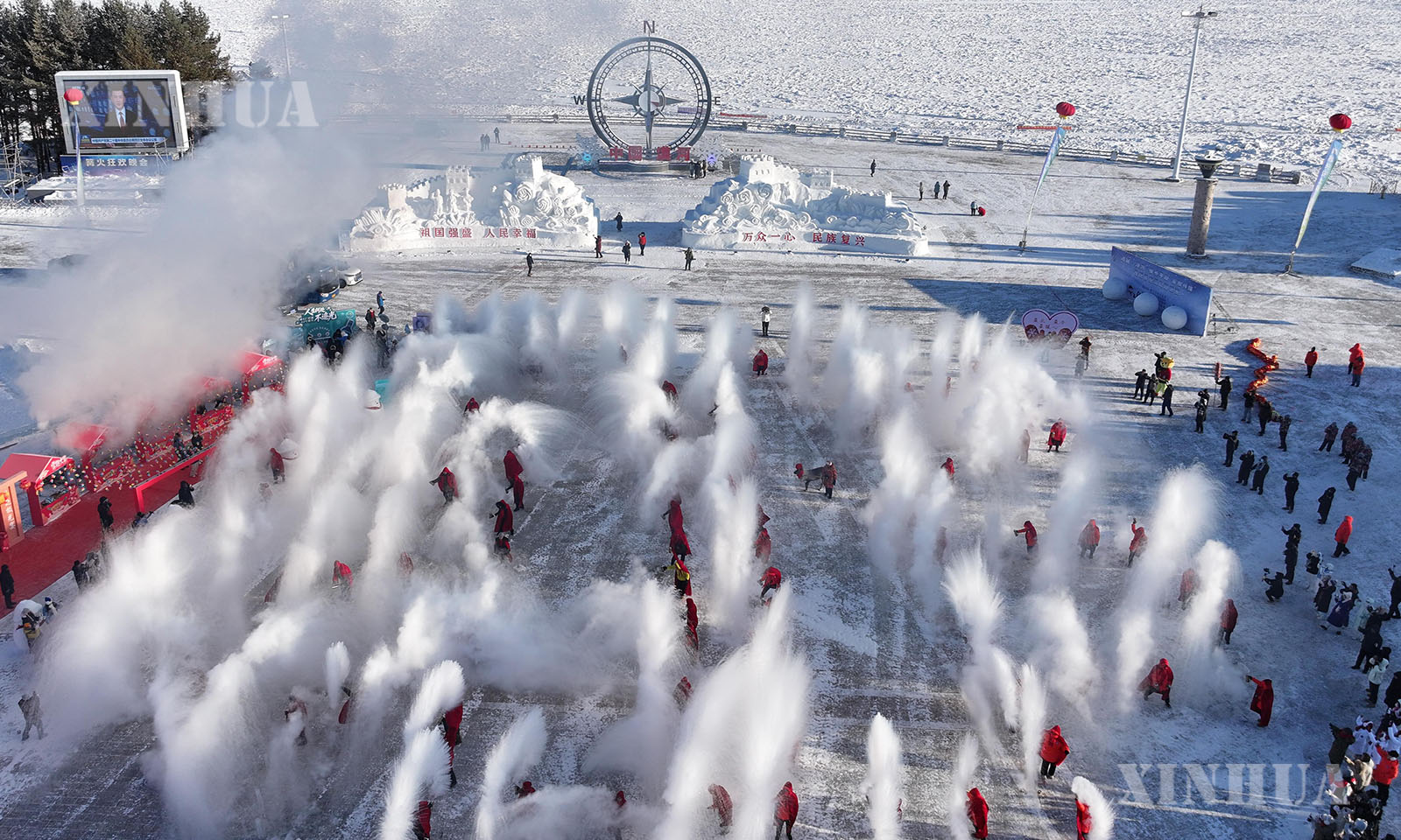 1、12月21日在北极村七星广场拍摄的“泼水成冰”表演(无人机照片)。 新华社发(邵天李摄)