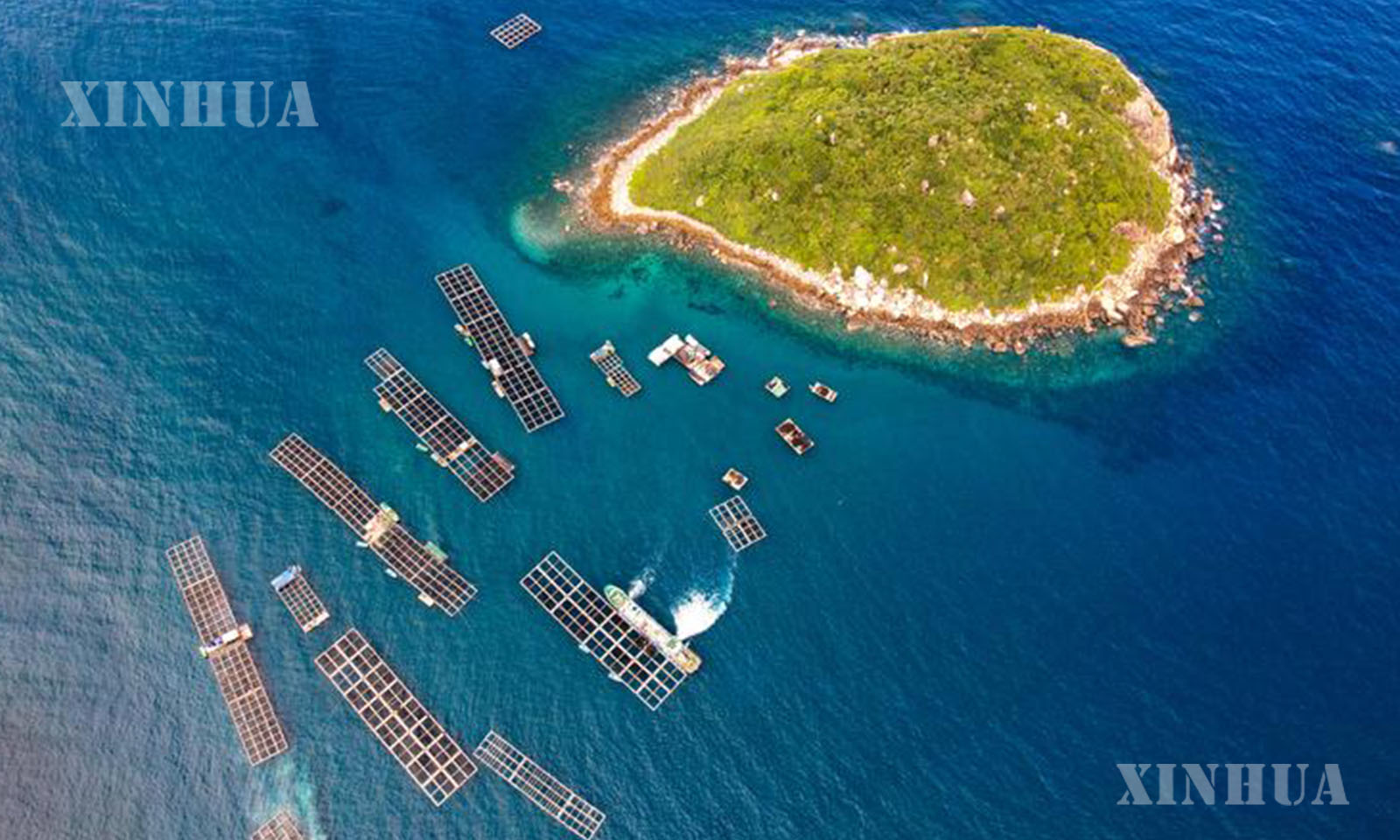 1. 日本籍渔船在海南省万宁市附近海域装运章雄鱼苗(5月15日摄,无人机照片)。新华社记者 杨冠宇 摄