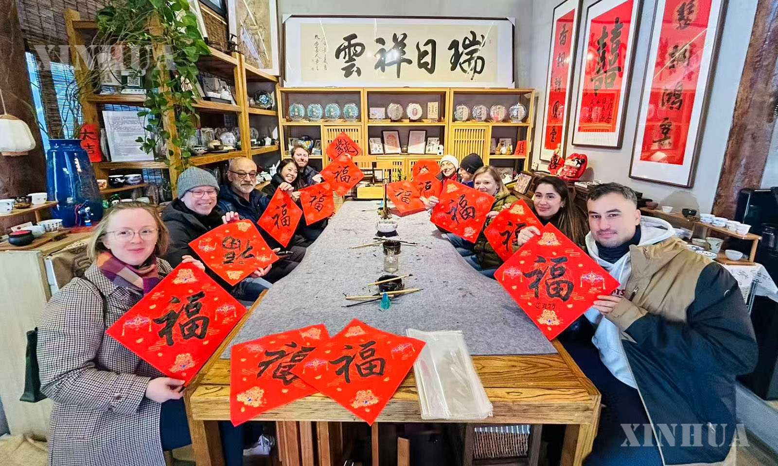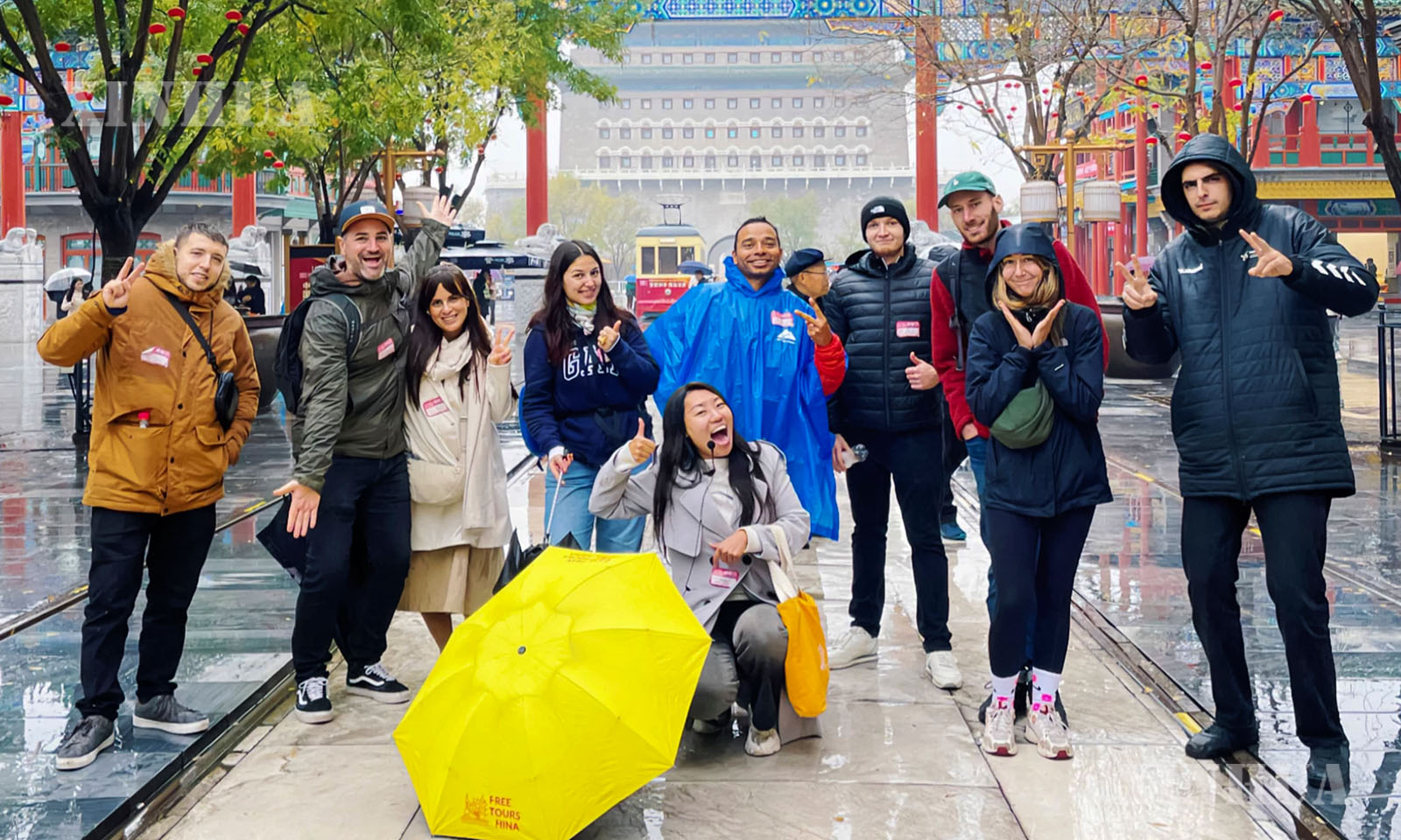 1、2024年11月,入境旅游策划师孙姝俐团队带领外国游客在北京前门大街合影。 新华社发