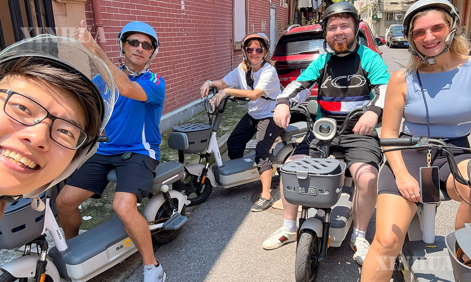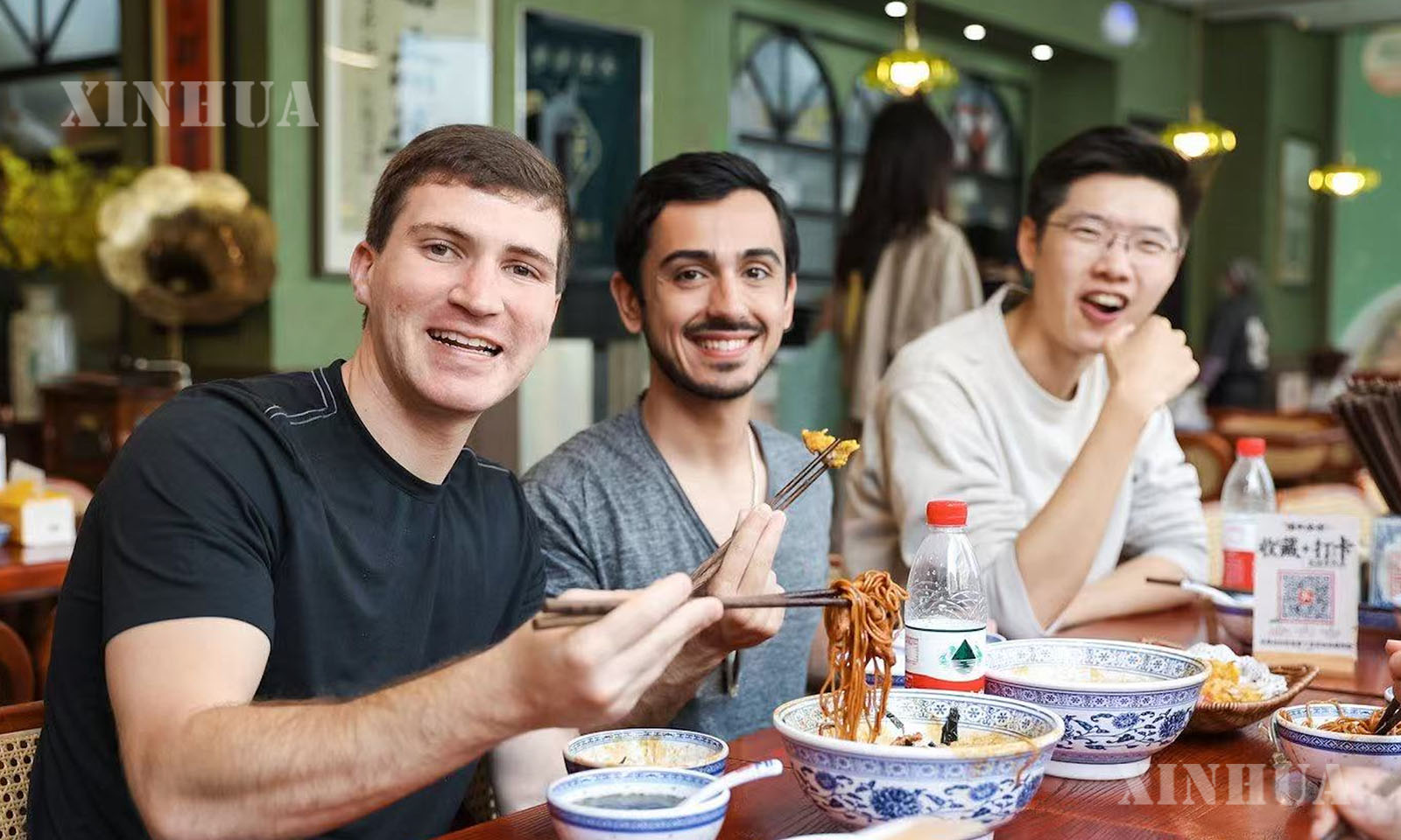 တရုတ်နိုင်ငံ ရှန်ဟိုင်းမြို့တွင် “အရှေ့ဘက်သို့ခရီးသွားခြင်း” အဖွဲ့ ဧည့်လမ်းညွှန်က နိုင်ငံခြားသား ခရီးသွားဧည့်သည်များကို ခေါ်ဆောင်၍ ရှန်ဟိုင်းစတိုင် ကြက်သွန်မြိတ်ဆီချက်ခေါက်ဆွဲ မြည်းစမ်းနေသည်ကို ၂၀၂၅ ခုနှစ် ဧပြီလကုန်ပိုင်းက တွေ့ရစဉ် (ဆင်ဟွာ)