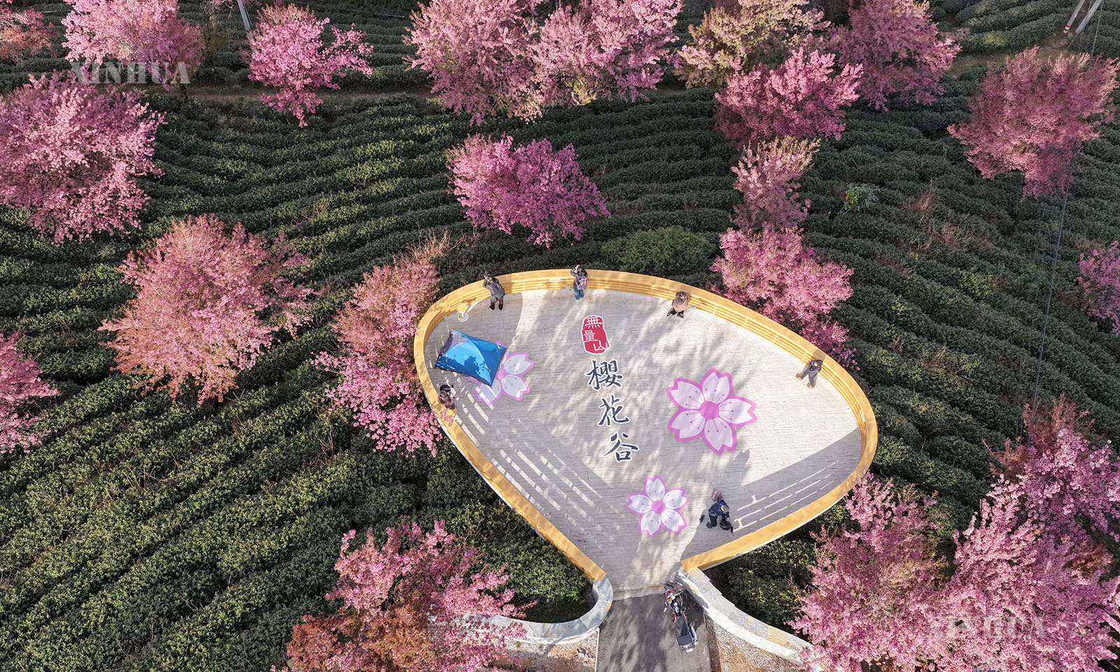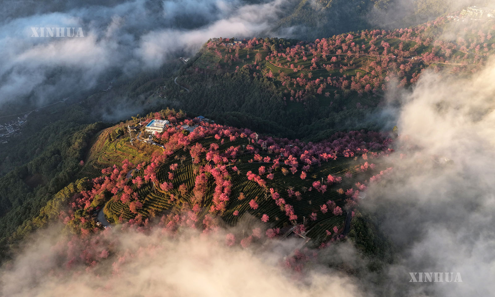 进入12月,云南省大理白族自治州南涧彝族自治县无量山樱花谷的冬樱花陆续绽放,与茶园、云海构成一幅美丽的山水画卷。
