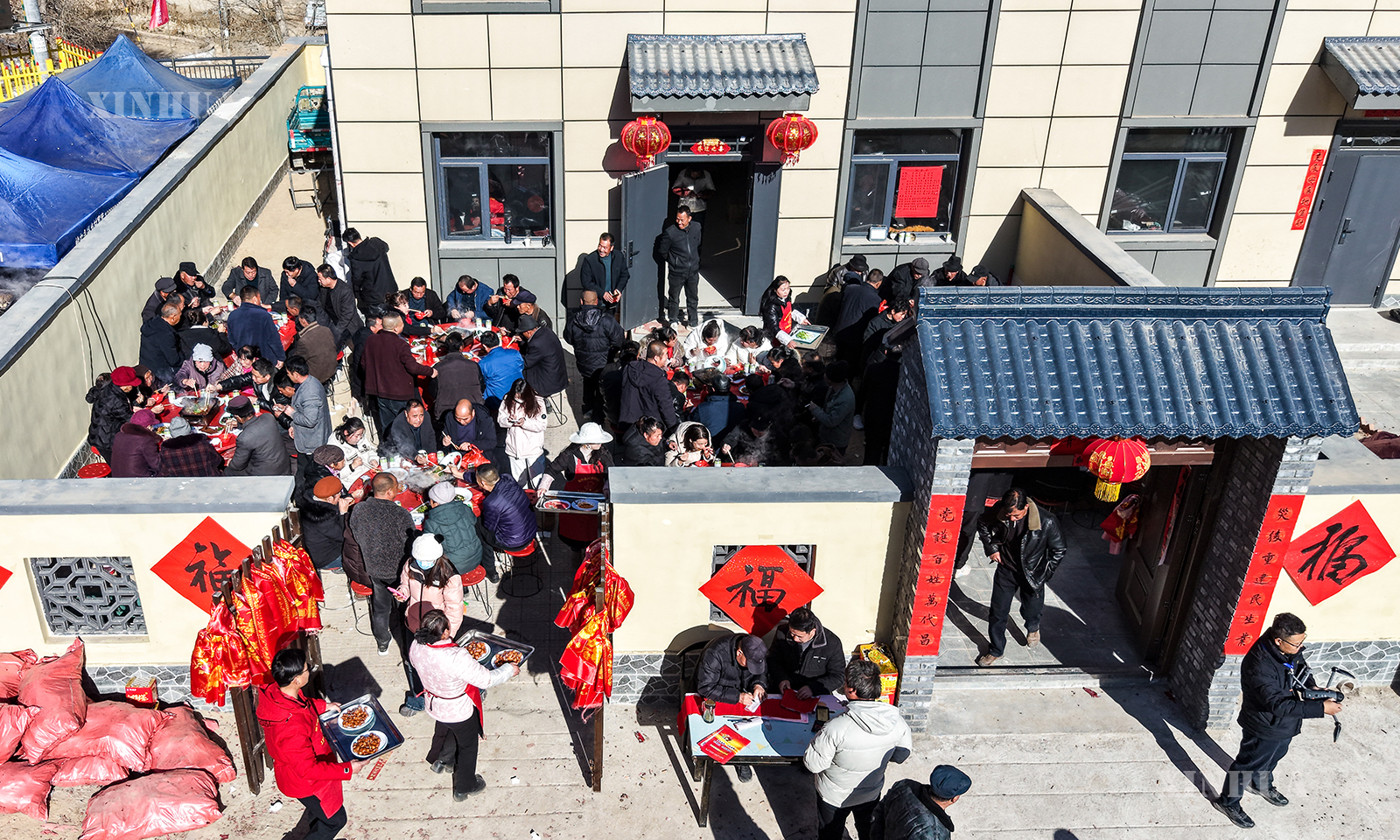 图说2:12月29日,村民在榆中县马坡乡马莲滩村集中安置点的新家里举办乔迁宴(无人机照片)。新华社记者 郎兵兵 摄