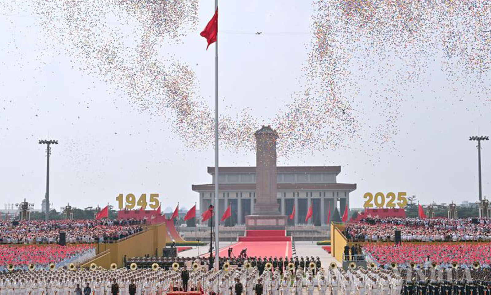 1. 2025年9月3日,纪念中国人民抗日战争暨世界反法西斯战争胜利80周年大会在北京隆重举行。这是纪念大会现场放飞气球。新华社记者 李贺 摄