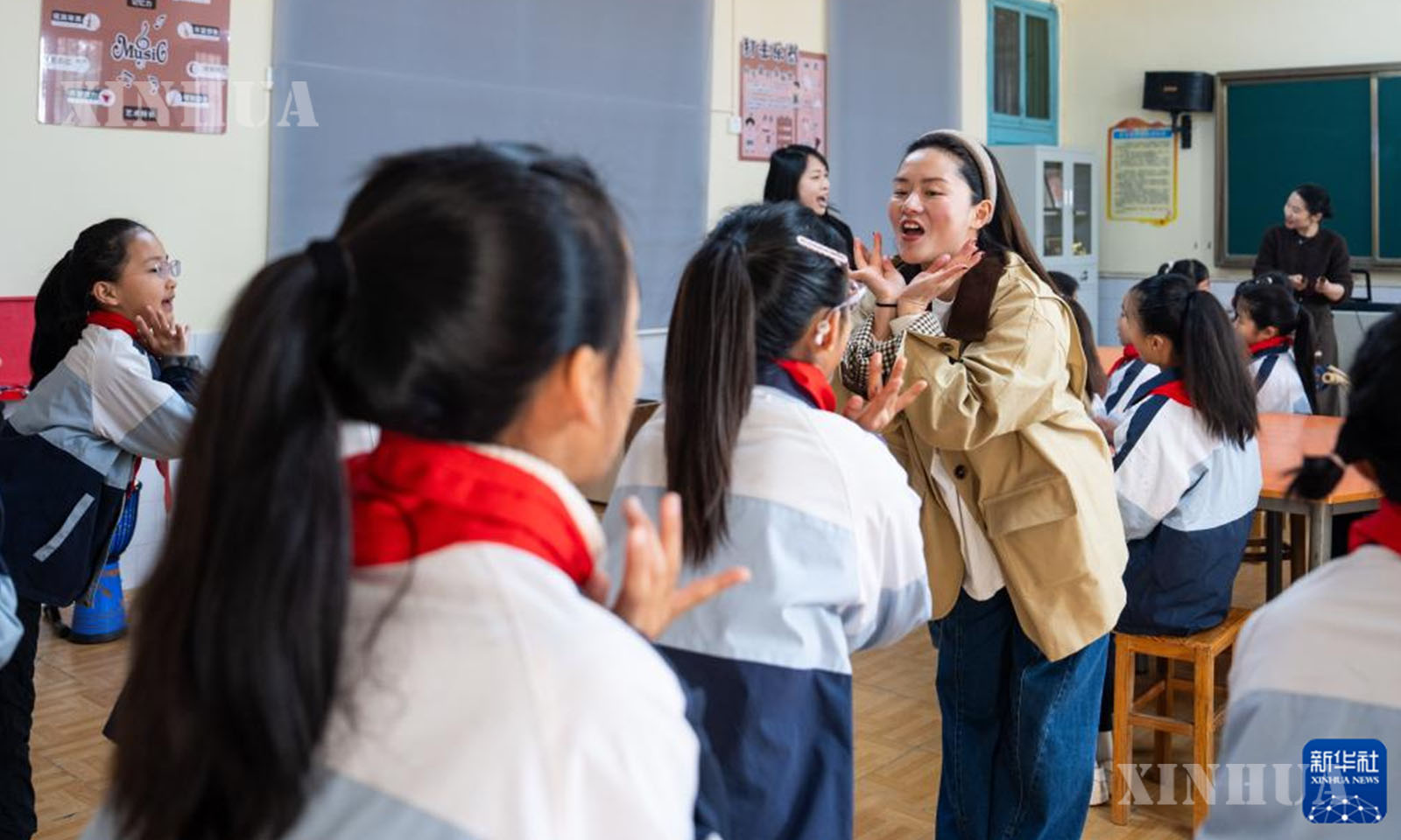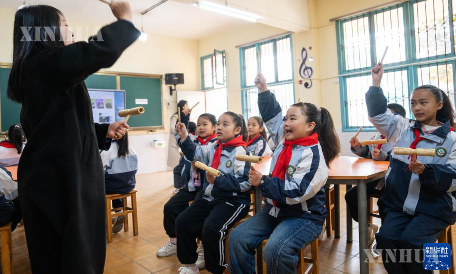 တရုတ်နိုင်ငံ ဟူနန်ပြည်နယ် နန်ရှန့်ခရိုင် ယိယန်မြို့ ဆန်းရှန်းဟူမြို့နယ် ဗဟိုအလယ်တန်းကျောင်းတွင် “ကျေးရွာသို့ ပို့ဆောင်ပေးခြင်း” ယန္တရားဖြင့် ရောက်ရှိလာသော ဂီတဆရာမက ကျောင်းသား၊ ကျောင်းသူများ စုပေါင်းသံပြိုင်သီဆိုမှု လေ့ကျင့်ရန် သင်ကြားပေးနေသည်ကို ၂၀၂၆ ခုနှစ် ဇန်နဝါရီ ၁၃ ရက်က တွေ့ရစဉ် (ဆင်ဟွာ)