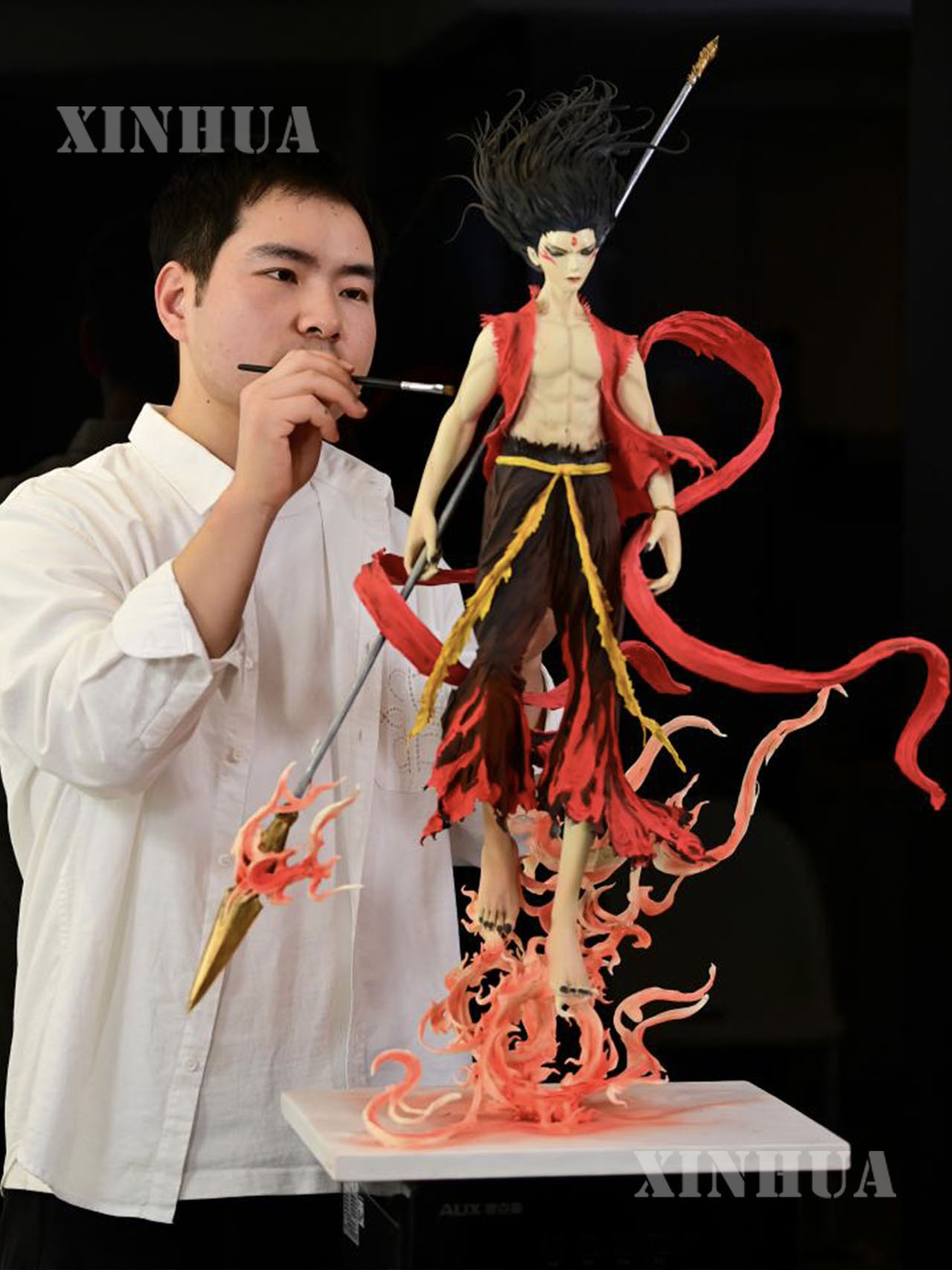 2、糖艺师张勃在为糖艺作品《哪吒》上色(1月13日摄)。新华社记者 邹竞一 摄