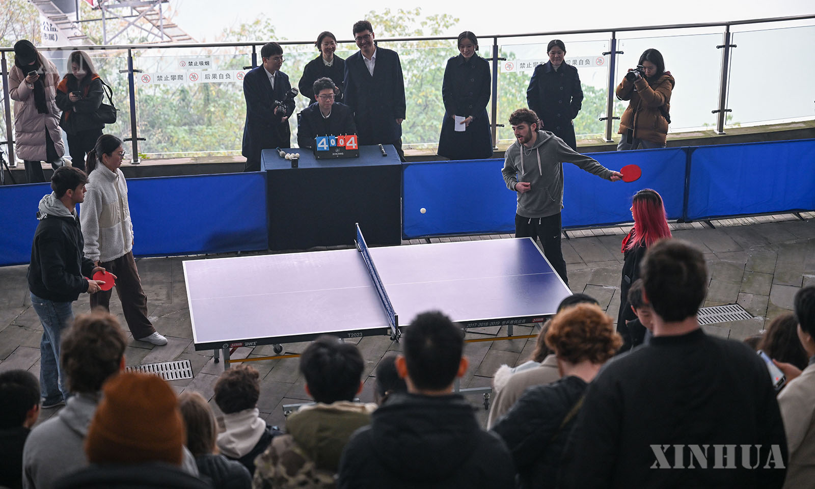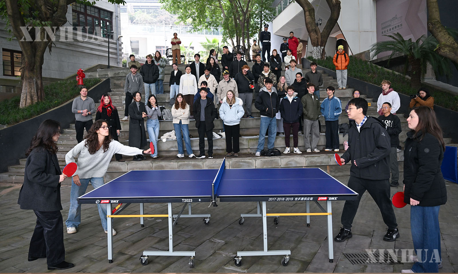 တရုတ်နိုင်ငံ ချုံချင့်မြို့ရှိ စတီးဝဲလ်ပြတိုက် အပြင်ဘက်နေရာ၌ တရုတ်-အမေရိကန် လူငယ်များ စားပွဲတင်တင်းနစ် ချစ်ကြည်ရေးပြိုင်ပွဲ ကျင်းပနေသည်ကို ၂၀၂၆ ခုနှစ် ဇန်နဝါရီ ၁၆ ရက်က တွေ့ရစဉ် (ဆင်ဟွာ)