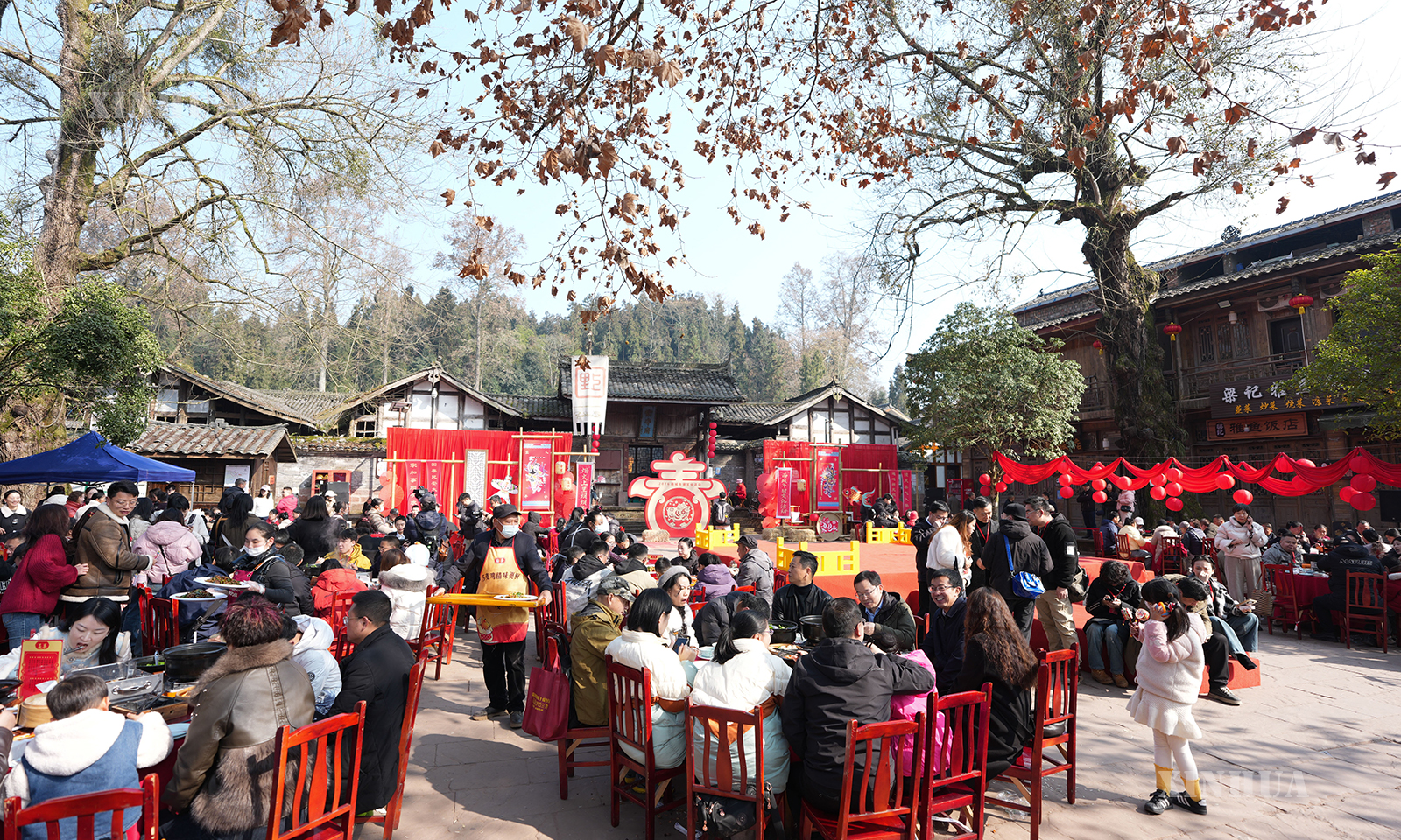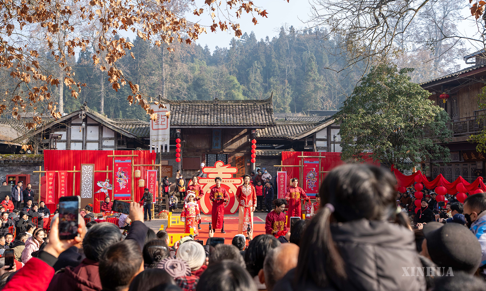 တရုတ်နိုင်ငံ စီချွမ်းပြည်နယ် ရာအန်းမြို့ ရှန့်ကူလီမြို့ဟောင်းတွင် တရုတ်ရိုးရာ လက်ထပ်မင်္ဂလာပွဲအတွက် သတို့သမီးအား သွားရောက်ကြိုဆိုမှု အခမ်းအနားအား အပြည့်အဝ ပါဝင်ခံစားနေသည့် မြို့သူ၊ မြို့သားနှင့် ခရီးသွားဧည့်သည်များကို ၂၀၂၆ ခုနှစ် ဇန်နဝါရီ ၁၇ ရက်က တွေ့ရစဉ် (ဆင်ဟွာ)