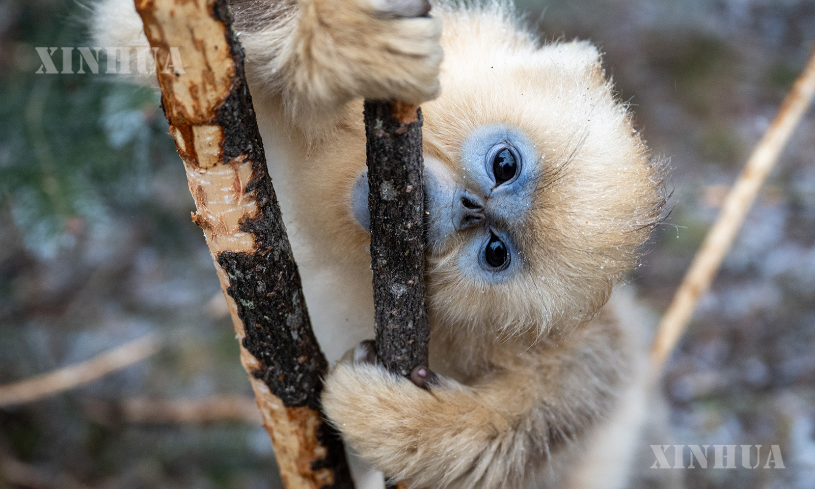 3、1月19日,一只金丝猴在神农架国家公园大龙潭金丝猴野外研究基地啃食树皮。新华社记者 杜子璇 摄