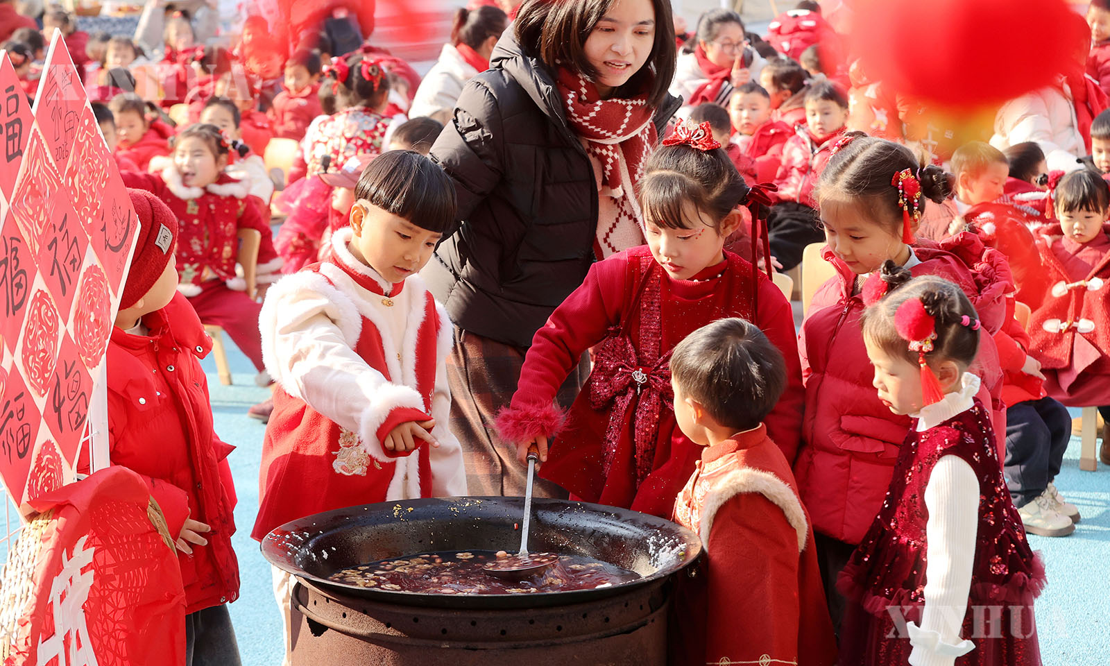 2、1月23日,在浙江省湖州市德清县新市镇第三幼儿园,小朋友体验煮腊八粥。新华社发(谢尚国 摄)