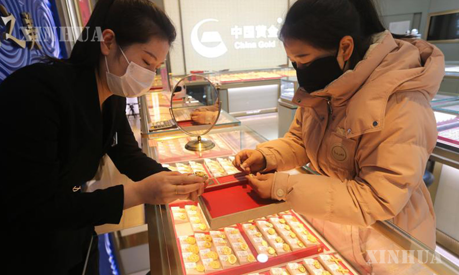 တရုတ်နိုင်ငံ ကျန်းဆူးပြည်နယ် လျန်ယွင်ကန်မြို့ လျန်ယွင်ခရိုင်ရှိ ရွှေဆိုင်တစ်ဆိုင်တွင် မြို့နေပြည်သူတစ်ဦးက ရွှေထည်ပစ္စည်းရွေးချယ်နေသည်ကို ၂၀၂၆ ခုနှစ် ဇန်နဝါရီ ၂၆ ရက်က တွေ့ရစဉ် (ဆင်ဟွာ)