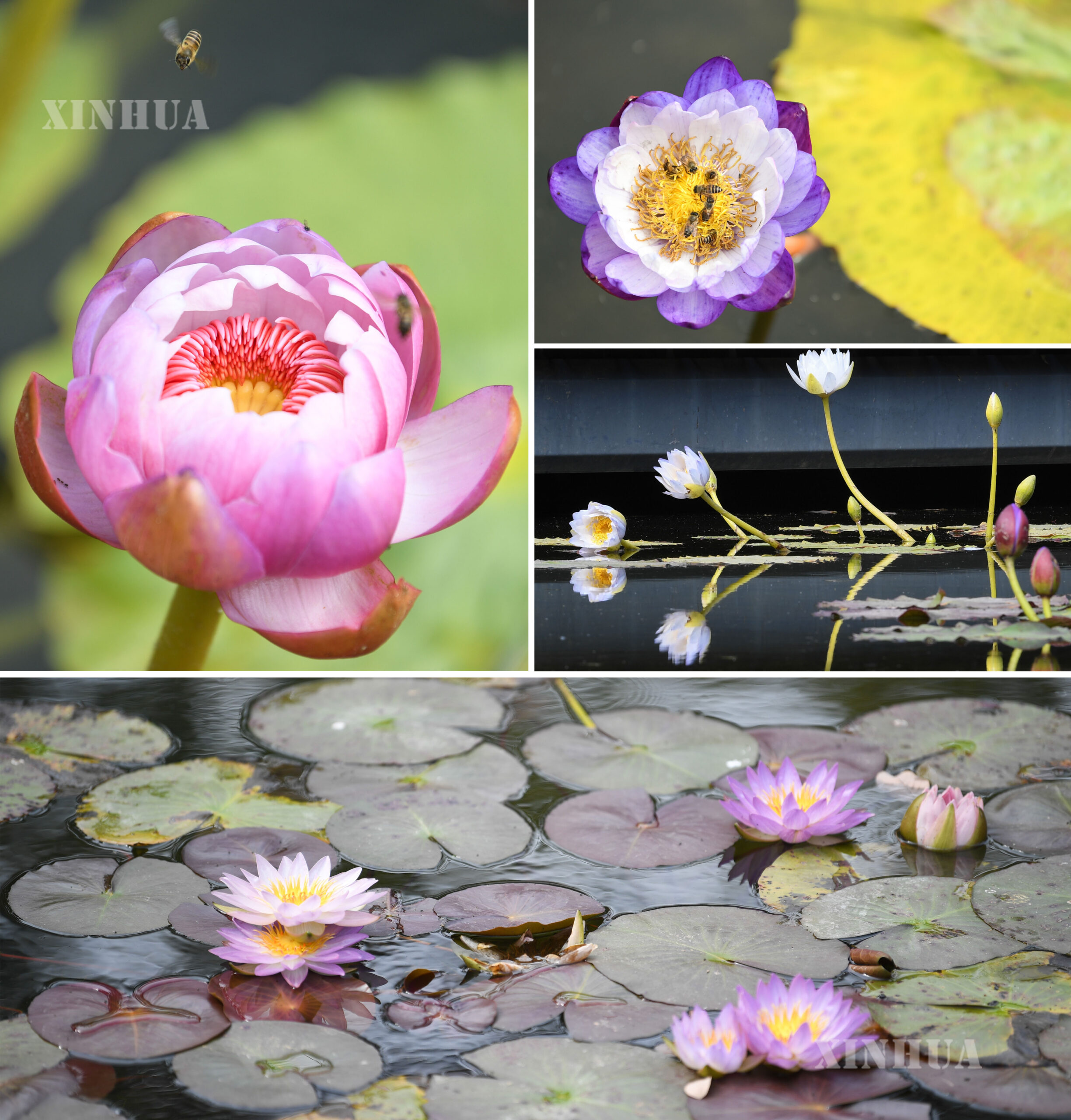 2、这是1月27日在广州云溪植物园拍摄的各种睡莲(拼版照片)。新华社记者 邓华 摄
