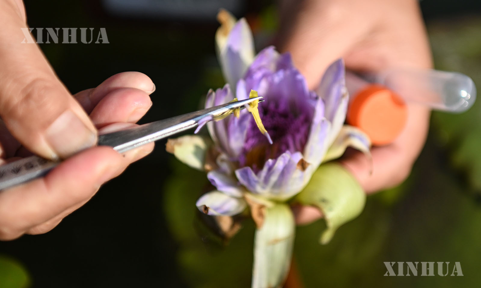 3、1月27日,在广州云溪植物园睡莲展示区,工作人员给睡莲施肥。 新华社记者 邓华 摄